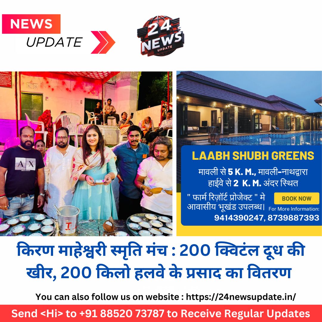 24 न्यूज अपडेट.उदयपुर। किरण माहेश्वरी स्मृति मंच की ओर से प्रसाद वितरण का कार्यक्रम आयोजित किया गया। नवरात्रि पर अम्बामाता मंदिर में भक्तों द्वारा मंच के माध्यम से प्रसाद वितरण का कार्यक्रम हुआ। राजसमंद विधायक दीप्ति माहेश्वरी ने भी भक्तों के साथ मिलकर प्रसाद वितरण कार्यक्रम में भाग लिया कार्यक्रम की शुरूआत माताजी की महाआरती से हुई। उसके बाद दो से तीन हजार लोगों ने 200 क्विटंल दूध की खीर, 200 किलो हलवे का प्रसाद ग्रहण किया। पुजारी रायसिंह तंवर द्वारा महाआरती का आयोजन किया।
