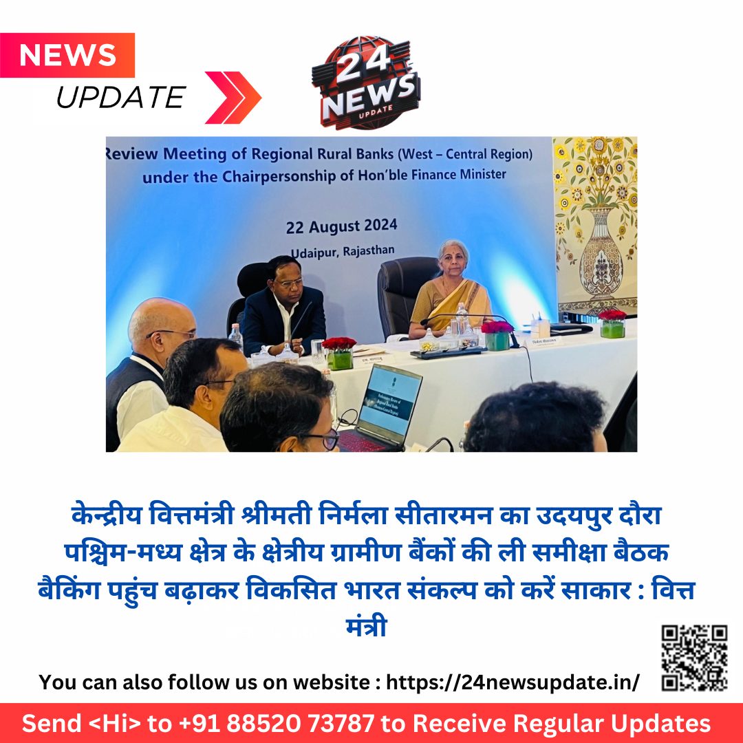 24 न्यूज़ अपडेट उदयपुर, 22 अगस्त। केंद्रीय वित्त एवं सहकारिता मामलात मंत्री श्रीमती निर्मला सीतारमन दो दिवसीय दौरे पर गुरुवार को उदयपुर पहुंचीं। वित्त मंत्री ने होटल लीला पैलेस में पश्चिम व मध्य क्षेत्र के क्षेत्रीय ग्रामीण बैंकों की समीक्षा बैठक ली। वहीं अपराह्न बाद एयरपोर्ट रोड़ स्थित स्मॉल इंडस्ट्रीज डवलपमेंट बैंक कार्यालय का निरीक्षण किया।
