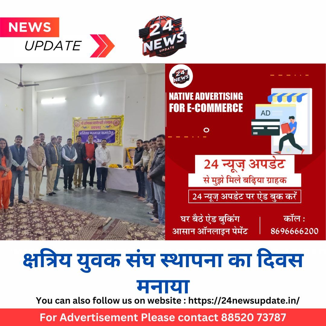 कविता पारख 24 न्यूज़ अपडेट निंबाहेड़ा । श्री क्षत्रिय युवक संघ का 79वाँ स्थापना दिवस मनाया गया। कार्यक्रम में सर्वप्रथम क्षत्रिय युवक संघ के लक्ष्मण सिंह बडौली ने पूज्य श्री तन सिंह जी की तस्वीर पर पुष्प अर्पित किए व दीप-प्रज्वलित किया।लक्ष्मण सिंह ने अपने उद्बोधन में श्री संघ प्रमुख का संदेश बताया और श्री क्षत्रिय युवक संघ की स्थापना पर प्रकाश डाला व श्री तन सिंह जी के त्याग व समर्पण की जानकारी दी।कार्यक्रम में होकम सिंह बरोठा, दिग्विजय सिंह चिकलाड,आनंद सिंह कुणी,लोकेंद्र सिंह सेलारपुरा,तेजपाल सिंह अंबावली, राजेंद्र सिंह बिलेश्वरी ,नरेंद्र सिंह गंधेर, प्रेम सिंह रिछावरा, दिलीप सिंह होरी हनुमान ,सुरेंद्र सिंह अरनोद ,राजेंद्र सिंह खोडाना,महेंद्र सिंह चमना का पिपलिया,अंतर सिंह कोलवी मंदिर,कारु सिंह बरडिया, राजेंद्र सिंह नागौर सहित सहित कई क्षत्रिय उपस्थित है। Share this: Share on X (Opens in new window) X Share on Facebook (Opens in new window) Facebook More Email a link to a friend (Opens in new window) Email Share on WhatsApp (Opens in new window) WhatsApp Like this:Like Loading... Related Discover more from 24 News Update Subscribe to get the latest posts sent to your email. Type your email… Subscribe Post navigation एक पेड़ माँ के नाम अभियान के तहत मालीखेड़ा विद्यालय में पौधारोपण कार्यक्रम आयोजित कोटडी कला विद्यालय में जरूरतमंदो को किए स्वेटर पर वितरित