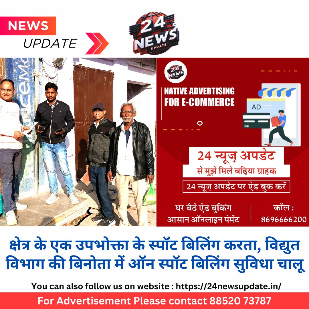 24 न्यूज़ अपडेट निंबाहेड़ा . बिनोता निंबाहेड़ा ग्रामीण के बिनोता में अजमेर विद्युत वितरण निगम लिमिटेड नए साल में स्पॉट बिलिंग सुविधा मंगलवार को शुरू कर दी गई है। सहायक अभियंता योगेश पांचाल एवं क्षेत्र के कनिष्ठ अभियंता अभिनव चावला ने बताया कि नई व्यवस्था के तहत अब बिजली का बिल 2 माह की बजाय हर माह मिलेगा। बिल को दफ्तर में जाकर जमा करने की बजाय ऑन द स्पॉट ही जमा किया जा सकेगा। विधुत विभाग की नयी व्यवस्था के बाद मंगलवार को बिनोता में विभागीय कर्मचारी विजेंद्र , व पप्पू लाल द्वारा स्पॉट बिलिंग मशीन के जरिये कर्मचारी ऑन द स्पॉट मीटर रीडिंग एवं फोटो मशीन की सहायता से तुरंत विद्युत बिल बनाने का कार्य प्रारंभ किया बिल डाउनलोड कर उपभोक्ताओं को सौंपें। इसके बाद उपभोक्ता चाहे तो हाथोहाथ ऑनलाइन या अगले 10 दिनों में विभाग के कैश काउंटर पर