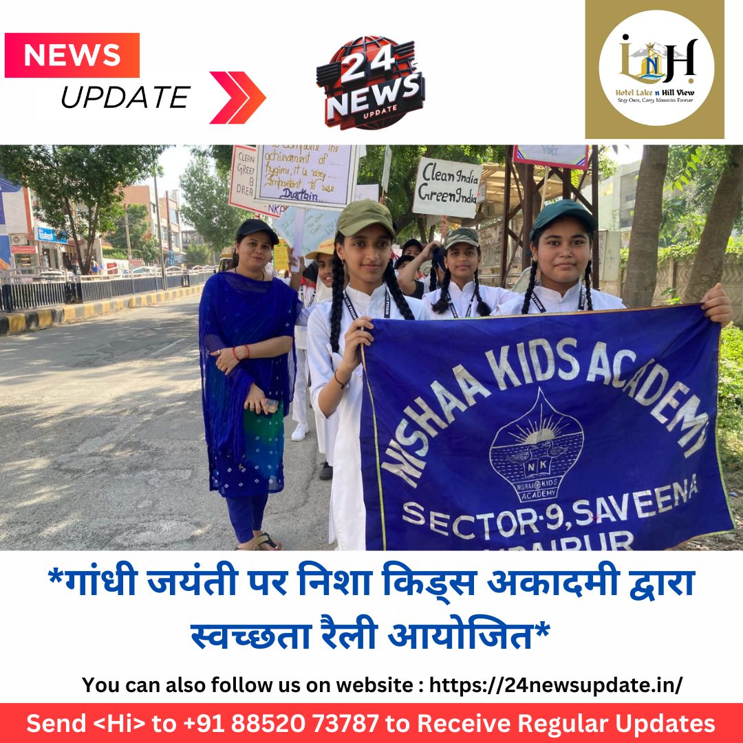गांधी जयंती के अवसर पर निशा किड्स अकादमी, सेक्टर 9 ने प्रधानमंत्री नरेंद्र मोदी द्वारा शुरू किए गए स्वच्छ भारत मिशन के तहत एक स्वच्छता रैली का आयोजन किया। रैली ने सविना सेक्टर 9 में स्वच्छता के महत्व को बताते हुए “स्वच्छता ही सेवा है” जैसे नारों के साथ लोगों को जागरूक किया। इस कार्यक्रम का उद्देश्य समुदाय को साफ-सफाई बनाए रखने और स्वस्थ जीवनशैली अपनाने के लिए प्रेरित करना था। Share this: Share on X (Opens in new window) X Share on Facebook (Opens in new window) Facebook More Email a link to a friend (Opens in new window) Email Share on WhatsApp (Opens in new window) WhatsApp Like this:Like Loading... Related Discover more from 24 News Update Subscribe to get the latest posts sent to your email. Type your email… Subscribe Post navigation उदयपुर जिले में पैंथर की दहशत का दौर जारी, गोगुंदा के बाद अब डाकन कोटड़ा में पैंथर की दस्तक रेलवे स्टेशन को बम से उड़ाने की धमकी के बावजूद सतर्कता नहीं, जांच के नाम पर खानापूर्ति
