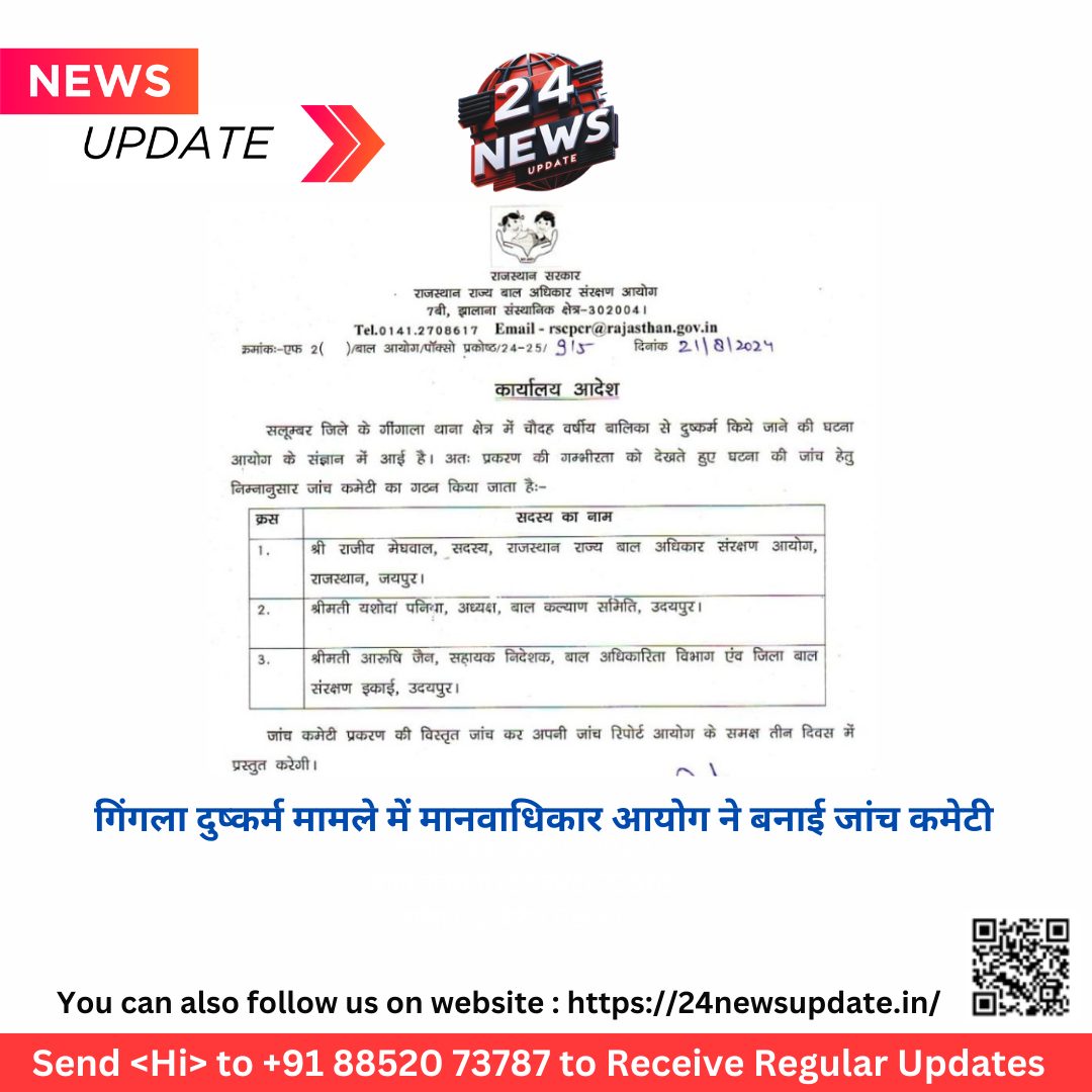 24 न्यज अपडेट. सलूंबर। सलूम्बर जिले के गिंगला थाना क्षेत्र में नाबालिग को अगवा करके दुष्कर्म करने के मामले में एक पहल हुई है। राजस्थान राज्य बाल अधिकार संरक्षण आयोग ने लिया मामले में संज्ञान। प्रकरण की गम्भीरता को देखते हुए घटना की जांच हेतु जांच कमेटी का गठन किया है। कमिटी में राजीव मेघवाल, सदस्य, राजस्थान राज्य बाल अधिकार संरक्षण आयोग,यशोदा पनिथा, अध्यक्ष, बाल कल्याण समिति, उदयपुर व आरूषि जैन, सहायक निदेशक, बाल अधिकारिता विभाग एंव जिला बाल संरक्षण इकाई, उदयपुर को किया कमेटी में -जांच कमेटी प्रकरण की विस्तृत जांच कर अपनी जांच आयोग के समक्ष तीन दिवस में प्रस्तुत करेगी रिपोर्ट।