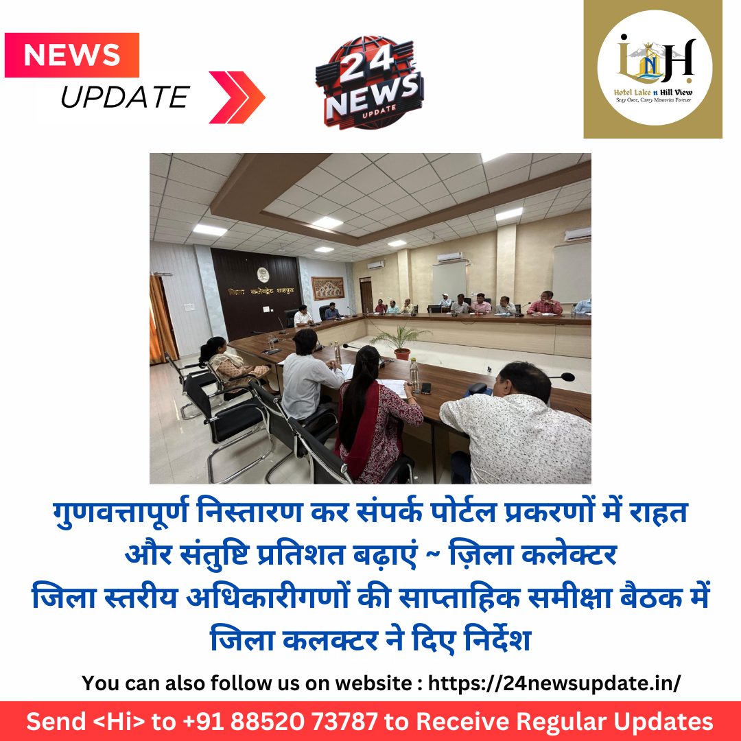 24 न्यूज़ अपडेट शाहपुरा. जिला स्तरीय अधिकारीगण की साप्ताहिक समीक्षा बैठक सोमवार को जिला कलेक्टर राजेंद्र सिंह शेखावत की अध्यक्षता में कलेक्ट्रेट सभागार में आयोजित हुई। इस दौरान जिला कलेक्टर शेखावत ने कहा कि संपर्क पोर्टल प्रकरणों का गुणवत्तापूर्ण निस्तारण करते हुए इनमें राहत और संतुष्टि प्रतिशत को बढ़ाने के लिए समस्त अधिकारियों द्वारा गंभीरतापूर्वक कार्रवाई की जाए।