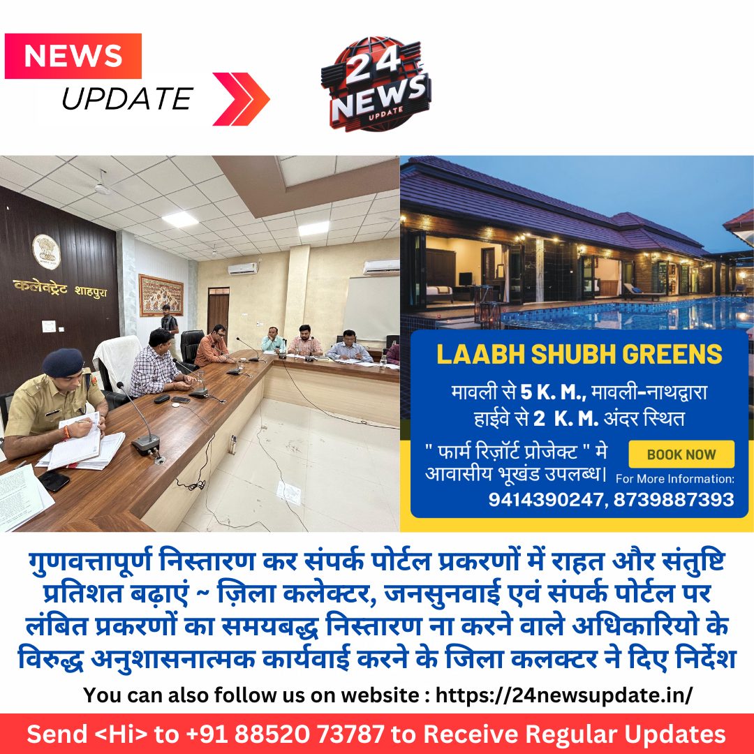 24 न्यूज़ अपडेट शाहपुरा, जिला स्तरीय अधिकारीगण की साप्ताहिक समीक्षा बैठक बुधवार को जिला कलेक्टर राजेंद्र सिंह शेखावत की अध्यक्षता में कलेक्ट्रेट सभागार में आयोजित हुई। इस दौरान जिला कलेक्टर शेखावत ने कहा कि संपर्क पोर्टल पर प्रकरणों का गुणवत्तापूर्ण निस्तारण करते हुए इनमें राहत और संतुष्टि प्रतिशत को बढ़ाने के लिए समस्त अधिकारियों द्वारा गंभीरतापूर्वक कार्रवाई की जाए।ज़िला कलेक्टर ने बैठक में अधिक समय तक निरंतर प्रकरणों को लंबित रखने वाले अधिकारियो के विरुद्ध एडीएम श्री पुनिया को अनुशासनात्मककार्यवाई करने के निर्देश दिए |बैठक में संपर्क पोर्टल पर लंबित प्रकरणों की समीक्षा करते हुए जिला कलक्टर श्री शेखावत ने कहा कि समस्त अधिकारी निर्धारित समय अवधि के भीतर प्रकरणों का निस्तारण करें। निर्धारित समयावधि के पश्चात प्रकरण लंबित नहीं रहने चाहिए। समस्त अधिकारी नियमित रूप से संपर्क पोर्टल प्रकरणों की मॉनिटरिंग करें और उन्हें निस्तारित करें। उन्होंने कहा कि प्रकरण निस्तारण के पश्चात रिलीफ प्रकरणों में संबंधित अधिकारी परिवादियों से संपर्क कर यह सत्यापित करें कि उक्त प्रकरण निस्तारण होने के पश्चात राहत मिल गई हैबजट घोषणाओं के क्रियान्वयन की समीक्षा करते हुए जिला कलेक्टर ने संबंधित अधिकारियों को उक्त कार्य जल्द पूर्ण करने के निर्देश दिए। प्रति सप्ताह इसकी मोनिटरिंग भी की जाएगी।बैठक में मौसमी बीमारियों की रोकथाम के लिए ज़िला कलेक्टर द्वारा चिकत्सा विभाग को प्रभावी निर्देश दिए गए।बैठक में ज़िला कलेक्टर शेखावत ने सभी विभागीय अधिकारियो को निर्देशित किया की समस्त जन कल्याणकारी योजनाओं से वंचित पात्रों को लाभान्वित किया जाए तथा इसके लिए विभागीय अधिकारी नियमित रूप से कार्रवाई करें।जिला कलेक्टर शेखावत ने कहा कि समस्त अधिकारी राज्य सरकार की मंशा के अनुसार आमजन को जन कल्याणकारी योजनाओं का लाभ देते हुए बजट घोषणाओं का क्रियान्वयन जल्द से जल्द सुनिश्चित करें।ज़िले की 125 ग्राम पंचायतों में आयोजित हुए किसान चौपाल , किसानों को मिली कृषि संबंधी नवीनतम जानकारीबैठक में कृषि विभाग के सहायक कृषि अधिकारी डॉ दीपक कोली ने बताया की ज़िला कलेक्टर शेखावत के आदेशानुसार कृषि विभाग के संयुक्त निदेशक रमेश आमेटा द्वारा ज़िले की 125 ग्राम पंचायतों में 21 अक्टूबर, 2024 से 25 अक्टूबर, 2024 के मध्य में संबंधित कृषि पर्यवेक्षक की उपस्थिति में किसान चौपाल का आयोजन करवाया गया | किसान चौपाल के अन्तर्गत रबी मौसम में डीएपी उर्वरक की कमी को देखते हुए कृषकों को विकल्प के रूप में एसएसपी, यूरिया एवं एन पी के के उपयोग की जानकारी दी गई साथ ही कृषि विभाग की योजनाओं की नवीनतम जानकारी भी कृषकों को दी गई