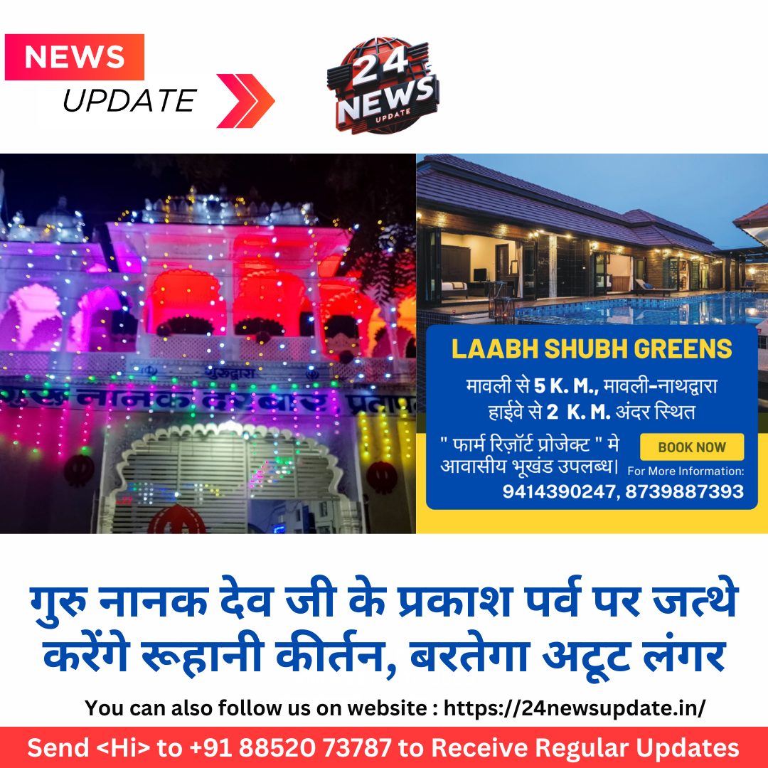 24 न्यूज अपडेट, उदयपुर। गुरुद्वारा श्री गुरु नानक दरबार प्रताप नगर, प्रकाश पर्व पर होंगे विविध आयोजन होगा। गुरुद्वारा श्री गुरु नानक दरबार प्रताप नगर में शुक्रवार को श्री गुरु नानक देव जी का 555 वा प्रकाश पर्व बहुत ही धूमधाम से मनाया जाएगा। गुरुद्वारा के सचिव सरदार राजेंद्र सिंह सोखी ने बताया कि इस उपलक्ष में 3 नवंबर से 13 नवंबर तक आस पास के क्षेत्रों में लगातार प्रभात फेरी निकाली गई थी। 13 नवंबर की सुबह से श्री अखंड पाठ साहिब रखा गया । जिसकी समाप्ति 15 नवंबर को होगी। 14 नवंबर आज श्री गुरु जी के निशान साहिब का चोला बदला गयां। सुबह 10ः00 बजे से विशेष दीवान सजाया जाएगा। जिसमें ज्ञानी बहादर सिंह का जतथा, व बाहर से आए हुए जतथे अपने रूहानी कीर्तन द्वारा संगत को निहाल करेंगे। जिसकी समाप्ति उपरांत गुरु का अटूट लंगर वितरण किया जाएगा। रात का दीवान सायकल 6ः30 बजे से सजेगी, जो रात्रि 10ः00 बजे समाप्त होगा। उसके उपरांत गुरु का अटूट लंगर वितरण किया जाएगा। इस उपलक्ष में गुरुद्वारा भवन को दीपमाला वह भव्य रोशनी से सजाया गया है। साथ ही अंत में भव्य आतिशबाजी का आयोजन भी रखा गया है।
