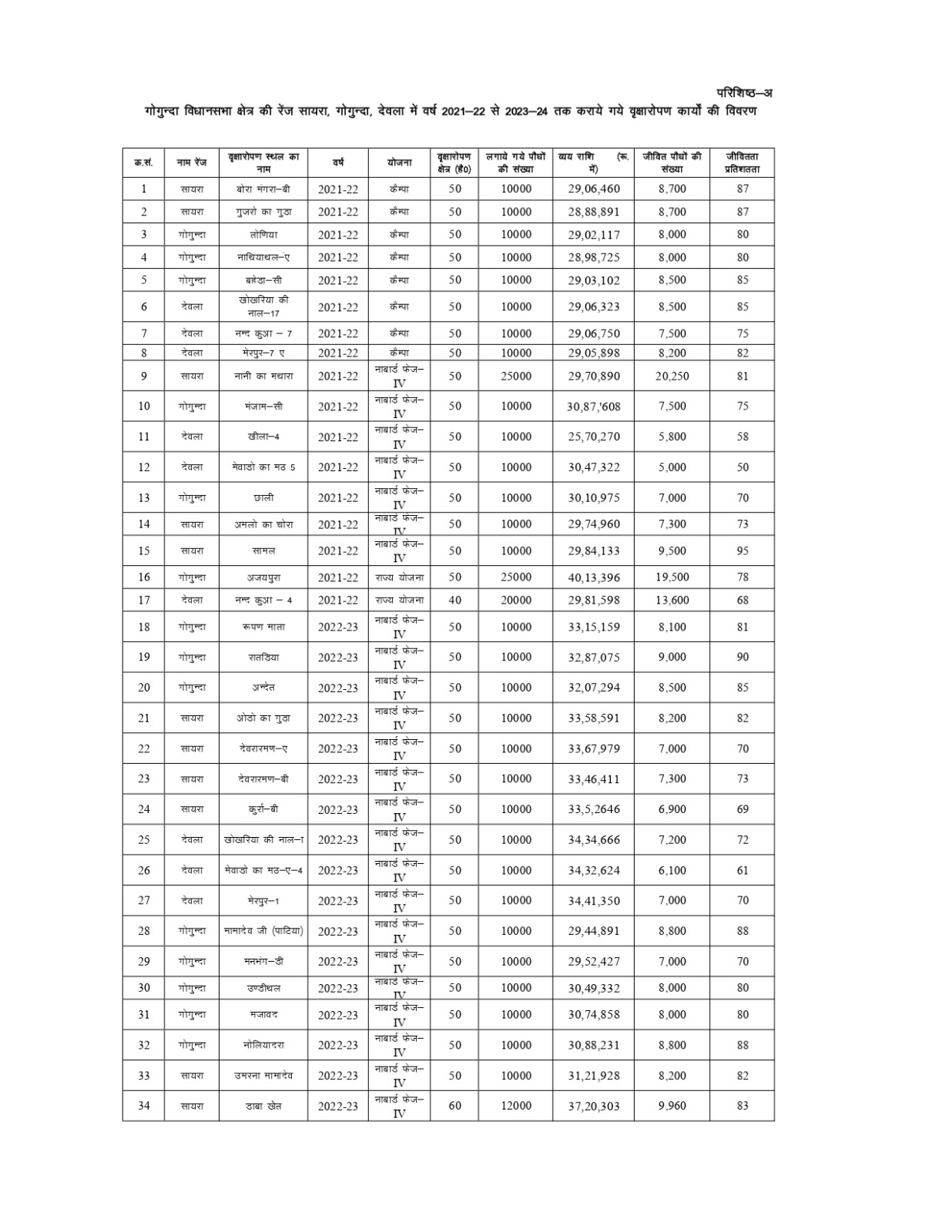 वन राज्य मंत्री प्रश्नकाल के दौरान सदस्य द्वारा इस संबंध में पूछे गए पूरक प्रश्नों का जवाब दे रहे थे। उन्होंने बताया कि विभाग द्वारा वन स्थिति एवं वृक्षारोपण कार्यक्रम की जांच की जाती है। थर्ड पार्टी से भी जांच कराई जाती है। इसके साथ ही केन्द्र सरकार द्वारा सेटेलाइट के माध्यम से भी वन क्षेत्र की जांच की जाती है। गोगुन्दा विधान सभा क्षेत्र की रेन्ज सायरा, गोगुन्दा, देवला में विगत तीन वर्षों में करवाये गये वृक्षारोपण एवं व्यय की गई राशि का योजनावार विवरण तथा उप वन संरक्षक उदयपुर (उत्तर) से प्राप्त सूचना अनुसार वर्तमान में जीवित पौधों की संख्या का विवरण सदन के पटल पर रखा जाए। मंत्रीजी ने जो सूचना रखी उसका आप खुद अवलोकन करें और तय करें कि कहां कितना जनता की गाढी कमाई का पैसा किस रूप में खर्च हो रहा है। मंत्रीजी की ओर से दी गइ सूचना में कुल 73 जगहों पर किए गए पौधारोपण का ब्योरा है। जब पूछा गया कि कितने पौधे जीवित हैं तो सारे फीगर केवल लपंसम बताए गए हैं एग्जेक्ट नहीं । इससे सवाल खडे होते हैं कि क्या वन विभाग केवल आंकडेबाजी कर रहा है या फिर जमीन पर भी काम हो रहा है।