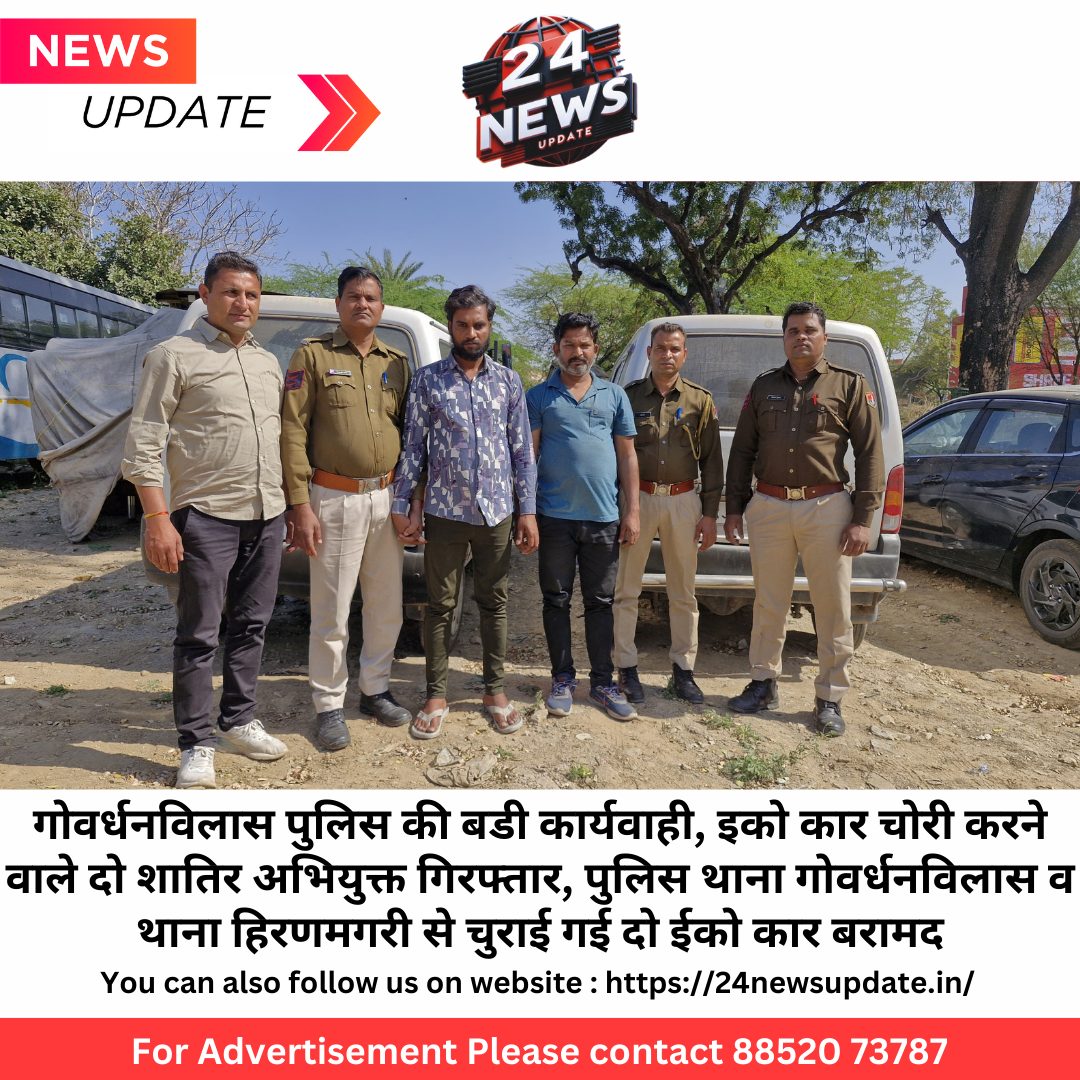 24 न्यूज़ अपडेट उदयपुर . जिला पुलिस अधीक्षक उदयपुर योगेश गोयल भा०पु०से० के निर्देशानुसार, गोपाल स्वरूप मेवाडा आरपीएस, अतिरिक्त पुलिस अधीक्षक (मुख्यालय) उदयपुर के सुपरविजन में सूर्यवीर सिंह राठौड वृताधिकारी वृत गिर्वा के निर्देशन में दिलीप सिंह झाला पु.नि. थानाधिकारी पुलिस थाना गोवर्धनविलास के नेतृत्व में गोवर्धनविलास पुलिस टीम ने गोवर्धनविलास थाना के प्रकरण संख्या 469/24 धारा 303(2) बीएनएस में कार्यवाही करते हुए अभियुक्त भारत उर्फ भरत वैरागी व सुरज सिंह उर्फ दादा भाई को गिरफतार किया गया है। उक्त दोनों अभियुक्तगण के कब्जे से थाना गोवर्धनविलास व थाना हिरणमगरी से चोरी की गई दो ईको कार को बरामद किया गया है।