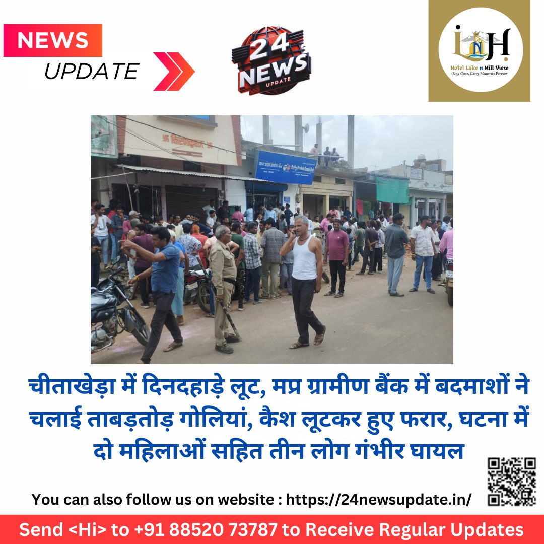 कविता पारख 24 न्यूज़ अपडेट नीमच। जिले के ग्राम चीताखेड़ा में एक बैंक में डकैती की घटना हुई है। बदमाशों ने गोलियां चलाकर बैंक में डकैती की घटना को अंजाम दिया है। इस घटना की भनक लगते ही समूचे क्षेत्र में सनसनी फैल गई। पुलिस व प्रशासन के आला अधिकारी भी मौके पर पहुंचे हैं।प्राप्त जानकारी के अनुसार ग्राम चीताखेड़ा के मप्र ग्रामीण बैंक में आज बुधवार सुबह दो बदमाशों ने गोलियां चलाकर लूट की घटना को अंजाम दिया है। बताया जा रहा है कि मुंह पर कपड़ा बांधे दो बदमाश मोटरसाइकिल से बैंक तक पहुंचे थे। बदमाशों ने गोलियां चलाकर बैंक से कैश लूटा है। इस घटना में दो महिलाओं सहित एक चपरासी गोली लगने से गंभीर रूप से घायल हुआ है। जिन्हें एंबुलेंस से नीमच रैफर किया गया है। घटना की सूचना मिलते ही पुलिस मौके पर पहुंची है। मामले में जांच की जा रही है। Share this: Share on X (Opens in new window) X Share on Facebook (Opens in new window) Facebook More Email a link to a friend (Opens in new window) Email Share on WhatsApp (Opens in new window) WhatsApp Like this:Like Loading... Related Discover more from 24 News Update Subscribe to get the latest posts sent to your email. Type your email… Subscribe Post navigation उदय रेज़ीडेंसी उदय श्याम मित्र मंडल द्वारा आयोजित गणेशोसत्व के अंर्तगत बड़ी धूमधाम से हुआ गजानन्द महाराज के विसर्जन के साथ हुआ समापन एवं आयोजित हुए प्रतिदिन विभिन्न कार्यक्रम श्री गंगेश्वर महादेव भंडार से ₹53000 निकले