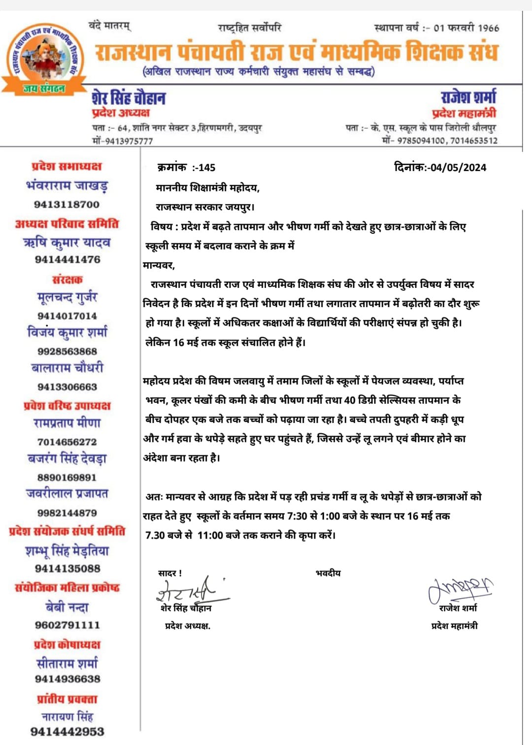 24 न्यूज अपडेट, उदयपुर। राजस्थान पंचायती राज एवं माध्यमिक शिक्षक संघ ने शिक्षा मंत्री को ज्ञापन भेजकर प्रदेश में बढ़ते तापमान और भीषण गर्मी को देखते हुए छात्र-छात्राओं के लिए स्कूली समय में बदलाव किए जाने की मांग की है। संघ के प्रदेश अध्यक्ष शेर सिंह चौहान व प्रांतीय महामंत्री राजेश शर्मा ने शिक्षा मंत्री मदन दिलावर को भेजे ज्ञापन में लिखा है कि प्रदेश में इन दिनों भीषण गर्मी तथा लगातार तापमान में बढ़ोतरी का दौर शुरू हो गया है। स्कूलों में अधिकतर कक्षाओं के विद्यार्थियों की परीक्षाएं संपन्न हो चुकी है। लेकिन 16 मई तक स्कूल संचालित होने हैं। संगठन के प्रांतीय महामंत्री राजेश शर्मा ने बताया कि प्रदेश की विषम जलवायु में तमाम जिलों के स्कूलों में समुचित पेयजल व्यवस्था उपलब्ध नहीं है, पर्याप्त भवन, कूलर पंखों की कमी के बीच भीषण गर्मी तथा 40 डिग्री सेल्सियस से अधिक तापमान के बीच दोपहर एक बजे तक बच्चों को बुलाया जा रहा है। स्कूल छुट्टी के बाद बच्चे तपती दुपहरी में कड़ी धूप और गर्म हवा के थपेड़े सहते हुए घर पहुंचते हैं, जिससे उन्हें लू लगने एवं बीमार होने का अंदेशा बना हुआ है। संघ ने शिक्षामंत्री से प्रदेश में पड़ रही प्रचंड गर्मी व लू के थपेड़ों से छात्र-छात्राओं को राहत देते हुए स्कूलों के वर्तमान समय 7ः30 से 1ः00 बजे के स्थान पर 16 मई तक 7.30 बजे से 11ः00 बजे तक कराने का आग्रह किया है।