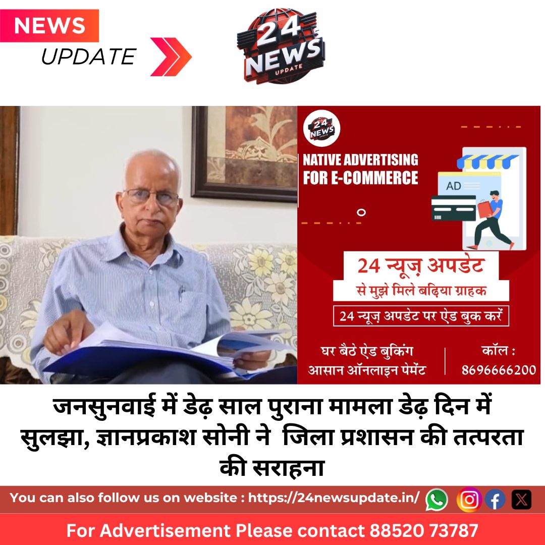 24 News Update उदयपुर | आमजन की समस्याओं के त्वरित निस्तारण के लिए राज्य सरकार की ओर से प्रारंभ की गई त्रिस्तरीय जनसुनवाई व्यवस्था सुशासन की मिसाल बन रही है। जनसुनवाई में आमजन की कई समस्याओं का त्वरित समाधान हो रहा है, जिससे लोग राहत महसूस कर रहे हैं और शासन-प्रशासन की संवेदनशीलता का अहसास कर रहे हैं। ऐसा ही एक मामला उदयपुर जिले में सामने आया, जहाँ एक परिवादी की डेढ़ साल पुरानी समस्या का मात्र डेढ़ दिन में निस्तारण कर दिया गया। त्वरित कार्रवाई से प्रसन्न होकर परिवादी ने राजस्थान के मुख्यमंत्री भजनलाल शर्मा को पत्र लिखकर जिला प्रशासन की तत्परता की प्रशंसा करते हुए आभार प्रकट किया।