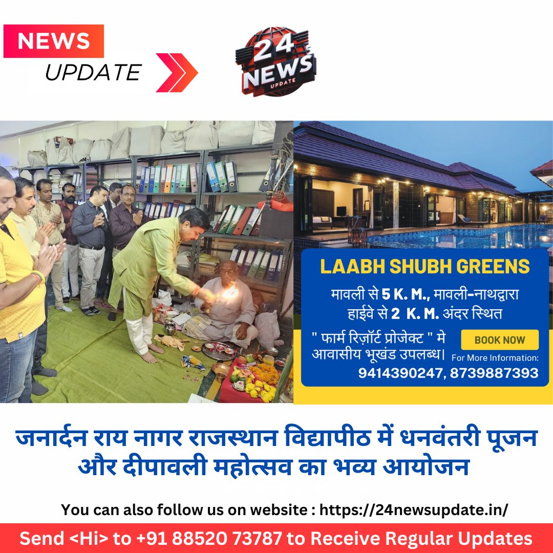 24 न्यूज़ अपडेट उदयपुर। जनार्दन राय नागर राजस्थान विद्यापीठ विश्वविद्यालय में दीपोत्सव के पावन अवसर पर आयोजित विशेष धनवंतरी पूजन और दिवाली महोत्सव विश्वविद्यालय के संघटक लॉ कॉलेज, श्रमजीवी कॉलेज और मुख्यालय में विधिपूर्वक मनाया गया। इस अनुष्ठान में विश्वविद्यालय के कुलपति कर्नल प्रो. एस.एस. सारंगदेवोत के सान्निध्य में मां लक्ष्मी और आरोग्य के देव धन्वन्तरि की पूजा-अर्चना की गई। पूजा के साथ विद्यापीठ की निरंतर उन्नति, प्रगति और समस्त कर्मचारियों के स्वास्थ्य एवं समृद्धि की कामना की गई।