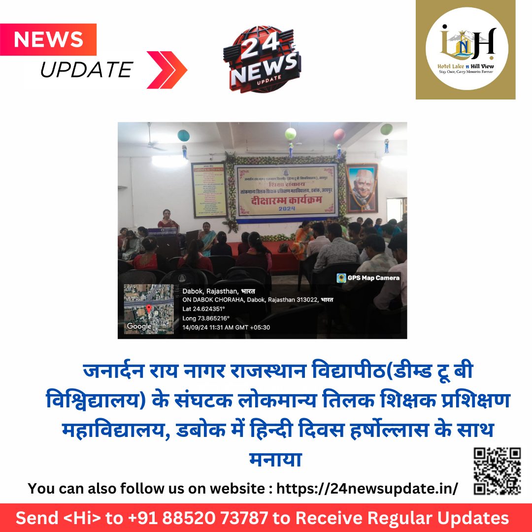 24 न्यूज अपडेट. डबोक। जनार्दनराय नागर राजस्थान विद्यापीठ (डीम्ड टू बी विश्वविद्यालय), उदयपुर के संघठक लोकमान्य तिलक शिक्षक प्रशिक्षण महाविद्यालय, डबोक में हिन्दी दिवस का आयोजन किया गया। प्राचार्य प्रो. सरोज गर्ग ने जानकारी देते हुए बताया कि हिन्दी दिवस के उपलक्ष्य में आयोजित समारोह में प्रशिक्षणार्थियों एवं संकाय सदस्यों ने राजभाषा हिंदी के स्वरूप के वैश्विक स्तरीय महत्व को प्रदर्शित करती कविताएं, गीत, कथाएं व ऐतिहासिक परिदृश्य को स्पष्ट करती प्रस्तुतियां प्रदान की। डॉ. अमी राठौड ने हिंदी पठन पाठन व लेखन में पारंगत होने का आह्वान करते हुए भावी शिक्षकों से निज भाषा एवं मातृभाषा पर गौरव करने की बात कही। वहीं हिंदी को राष्ट्र अस्मिता का प्रतीक बताते हुए महाविद्यालय के सहायक आचार्य डॉ. अमित कुमार दवे ने राजभाषा हिंदी के राष्ट्रभाषायी स्वयंभू स्वरूप पर प्रकाश डाला। डॉ. हरीश चौबीसा ने हिंदी को भारतवर्ष के कपाल पर उज्ज्वल तिलक की उद्घोषणा करती काव्यमय प्रस्तुति दी। श्रीमती रूपल सिंह तोमर ने हिंदी भाषा के संवैधानिक मूल्यों एवं विकास पर प्रकाश डाला। कार्यक्रम में प्रशिक्षणार्थी बालाराम सेन ने कविता प्रस्तुत करते हुए हिन्दी का आत्मसाथ करने हेतु प्रेरित किया।डॉ. तिलकेश आमेटा ने हिन्दी के व्यवहार में अभिमान अनुभव करने हेतु प्रेरित किया। इस अवसर पर महाविद्यालय के विभिन्न पाठ्यक्रमों के प्रशिक्षणार्थी उपस्थित रहे। अध्यक्षयीय उद्बोधन देते हुए प्राचार्य प्रो. सरोज गर्ग ने हिंदी भाषा को दिवस मात्र तक ही सीमित न कर आत्मार्पित करने का आवाहन किया। कार्यक्रम में हिंदी विभाग द्वारा अतिथियों का स्वागत किया गया। इस अवसर पर श्रीमती अनुपमा सुथार, डॉ. शानू शक्तावत, श्रीमती ऊषा शर्मा एवं डॉ. महेन्द्र कुमार वर्मा ने भी हिन्दी भाषा के संबंध में विचार व्यक्त किए एवं प्रस्तुति दी। साथ ही इस अवसर पर डॉ. सुनिता मुर्डिया , डॉ. अनिता कोठारी, डॉ. सरिता मेनारिया, डॉ. पुनित पंड्या, डॉ. हरिश मेनारिया, डॉ. रोमा एवं डॉ. इंदु आचार्य समेत समस्त विभागों के संकाय सदस्य उपस्थित थे। कार्यक्रम का संचालन डॉ.अमित कुमार दवे ने किया जबकि आभार ज्ञापन डॉ. रचना राठौड ने किया।