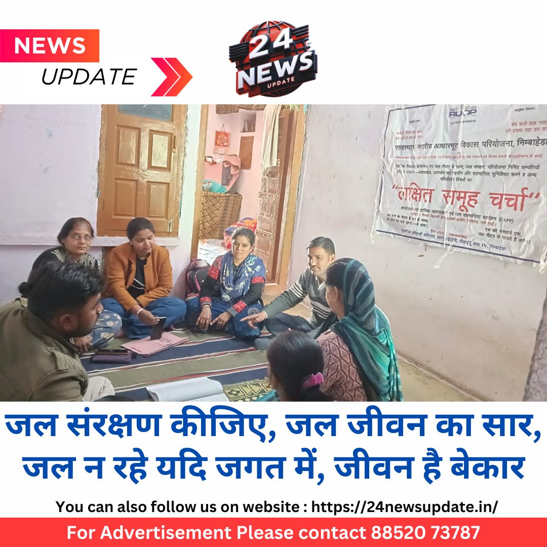 24 न्यूज़ अपडेट निंबाहेड़ा. राजस्थान नगरीय आधारभूत विकास परियोजना के अधीक्षण अभियंता मनीष अरोड़ा एवं अधिशाषी अभियंता सत्य नारायण वर्मा के निर्देशानुसार आज मोती बाजार खुशहाल स्वयं सहायता समूह के साथ जागरूकता कार्यक्रम के तहत बैठक आयोजित की गयी जिसमे सामुदायिक जागरूकता एवं जन सहभागिता इकाई के सामाजिक विकास अधिकारी तनुजा मरेठा ने बताया की “जल है तो कल है”, बावजूद इसके जल बेवजह बर्बाद किया जाता है। हमें यह नहीं भूलना चाहिए कि जल-संकट का समाधान जल के संरक्षण से ही है। हम हमेशा से सुनते आये हैं “जल ही जीवन है”। जल के बिना सुनहरे कल की कल्पना नहीं की जा सकती, जीवन के सभी कार्यों का निष्पादन करने के लिये जल की आवश्यकता होती है तथा आमजन को बताया की शहर मैं नई जल प्रदाय योजना के अंतर्गत पानी पर्याप्त एवं पूर्ण प्रेशर के साथ व मीटर युक्त मिलेगा और आमजन से अपील की जल सरंक्षण हमारा दायित्व ही नहीं कर्तव्य भी है पानी को किसी भी तरह बर्बाद नहीं करे आवश्यकतानुसार ही जल का उपयोग करे पानी की एक एक बून्द बचाएं आज की बचत कल का भविष्य है व कहा की आप इसमें सहयोग करे और अपने परिवार वालों से भी सहयोग के बारे मैं कहे कार्यक्रम मैं पानी के सरंक्षण पर महिलाओं की भूमिका पर बोलते हुए बताया की जल ही जीवन है जल के बिना जीवन की कल्पना मुश्किल है , जीवन के सभी कार्यो का निष्पादन करने के लिए जल की आवश्यकता होती है जल संसाधन पानी के वह स्त्रोत है जो मानव जाती के लिए उपयोग है , मुझे परियोजाना के तहत किये जा रहे विकास कार्यों से भविष्य में मिलने वाले लाभो और सुविधाओ के बेहतर उपाय वी रख रखरखाव पर बात की