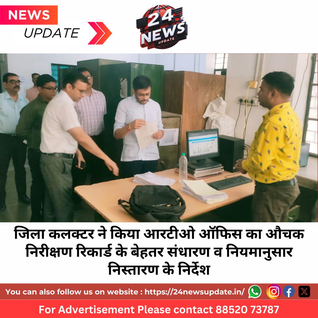 उदयपुर, 18 मार्च। जिला कलक्टर नमित मेहता ने मंगलवार सुबह चित्रकूट नगर स्थित प्रादेशिक परिवहन अधिकारी कार्यालय का औचक निरीक्षण किया। उन्होंने कार्यालय में कामकाज संबंधी जानकारी लेते हुए अधिकारियों को आवश्यक दिशा-निर्देश दिए।जिला कलक्टर श्री मेहता मंगलवार सुबह पंजाब के राज्यपाल व चण्डीगढ़ के गर्वनर श्री गुलाबचंद कटारिया के प्रस्थान पर प्रोटोकॉल में डबोक एयरपोर्ट गए। वहां से आते समय अचानक आरटीओ ऑफिस में पहुंचे। उन्होंने आरटीओ व डीटीओ कक्ष सहित कार्यालय की सभी शाखाओं का सघन निरीक्षण किया। इस दौरान कार्मिकों से संवाद कर कामकाज की जानकारी ली। निरीक्षण के दौरान दस्तावेजों व रिकार्ड के ढेर देखकर कलक्टर ने असंतोष व्यक्त किया। उन्होंने आरटीओ ज्ञानदेव विश्वकर्मा को रिकॉर्ड का बेहतर संधारण कराने तथा अधिक पुराने दस्तावेजों का विभागीय नियमानुसार निस्तारण कराने के निर्देश दिए। साथ ही उन्होंने कार्यालय परिसर की साफ-सफाई व रंगरोगन आदि कराकर अप-टू-डेट करने के भी निर्देश दिए।जिला कलक्टर ने लाइसेंस शाखा का निरीक्षण करते हुए वहां मौजूद आवेदकों से भी संवाद किया। उन्होंने लाइसेंस जारी करने, नवीनीकरण सहित अन्य कार्यों की प्रक्रिया की भी जानकारी ली। निरीक्षण के दौरान एडीएम सिटी वारसिंह, जिला परिवहन अधिकारी नितिन बोहरा सहित परिवहन निरीक्षक व कार्मिक उपस्थित थे। Share this: Share on X (Opens in new window) X Share on Facebook (Opens in new window) Facebook More Email a link to a friend (Opens in new window) Email Share on WhatsApp (Opens in new window) WhatsApp Like this:Like Loading... Related Discover more from 24 News Update Subscribe to get the latest posts sent to your email. Type your email… Subscribe Post navigation फील्ड क्लब में, आचार संहिता, बाहर चले रहे पार्टियों के दौर, ओएमआर शीट पर पड़ेंगे वोट, 22 तक नो ड्यूज पशु टीकाकरण महाभियान शुरू : 2 करोड़ 32 लाख पशुओं को निःशुल्क टीके लगाए जाएंगे