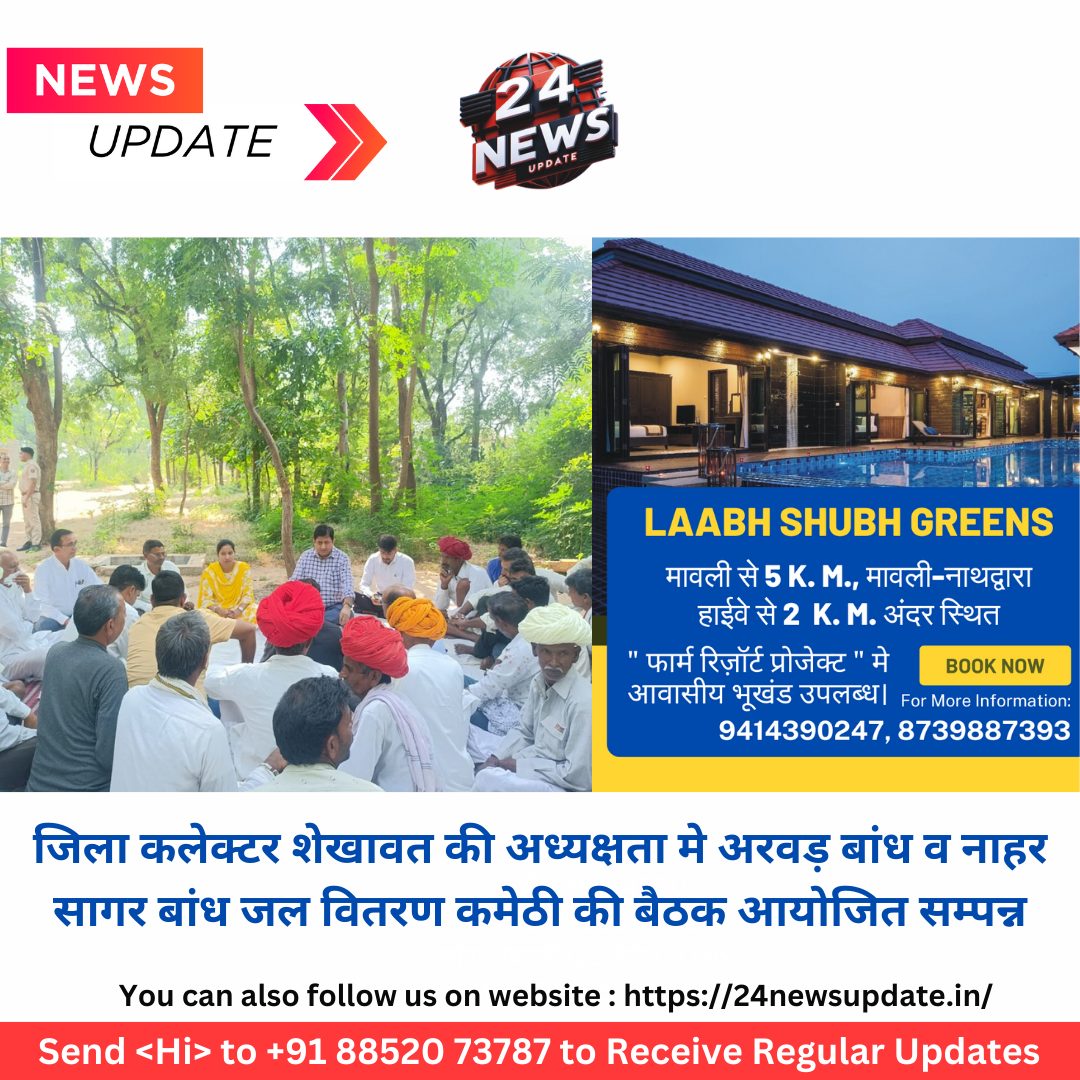 24 न्यूज़ अपडेट शाहपुरा. आज दिनांक 24.10.204 को जिला कलेक्टर शाहपुरा की अध्यक्षता मे प्रातः 11.00 बजे अरवड़ बांध जल वितरण कमेठी की बैठक आयोजित की गई जिसमे जल उपयोक्ता संगम के अध्यक्ष एवं सदस्यो, सरपंच एवं समस्त काश्तकारो ने सर्वसम्मति से यह निर्णय लिया गया कि बांध मे उपलब्ध पानी को रबि सिंचाई हेतु बांध की एल. एम. सी. नहर दिनांक 02.11.2024 को प्रातः 8.15 बजे खोली जायेगी जो लगातार शून्य गेज तक चलती रहेगी। एल. एम.सी. के ऊपर के आउटलेट तीन दिन तक बन्द रहेगें क्योकि पहले पानी टेल के काश्तकारो सिंचाई हेतु दिया जायेगा उसके बाद ऊपर के आउटलेट खोल दिये जायेगें ।