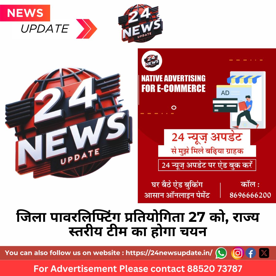 24 News Update उदयपुर। जिला पावरलिफ्टिंग संघ उदयपुर के तत्वावधान में आगामी 27 अप्रैल 2025, रविवार को लव कुश इनडोर स्टेडियम में जिला सीनियर, जूनियर, सब-जूनियर एवं मास्टर पुरुष एवं महिला इक्विप्ड पावरलिफ्टिंग प्रतियोगिता का आयोजन किया जाएगा। प्रतियोगिता का शुभारंभ प्रातः 9 बजे से होगा। इस संबंध में जानकारी देते हुए जिला पावरलिफ्टिंग संघ उदयपुर के सचिव विनोद साहू ने बताया कि प्रतियोगिता में भाग लेने के इच्छुक पुरुष एवं महिला खिलाड़ी आधार कार्ड एवं जन्म प्रमाण पत्र के साथ 27 अप्रैल को सुबह 9 बजे तक प्रतियोगिता स्थल पर अपनी प्रविष्टि जमा करवा सकते हैं।
