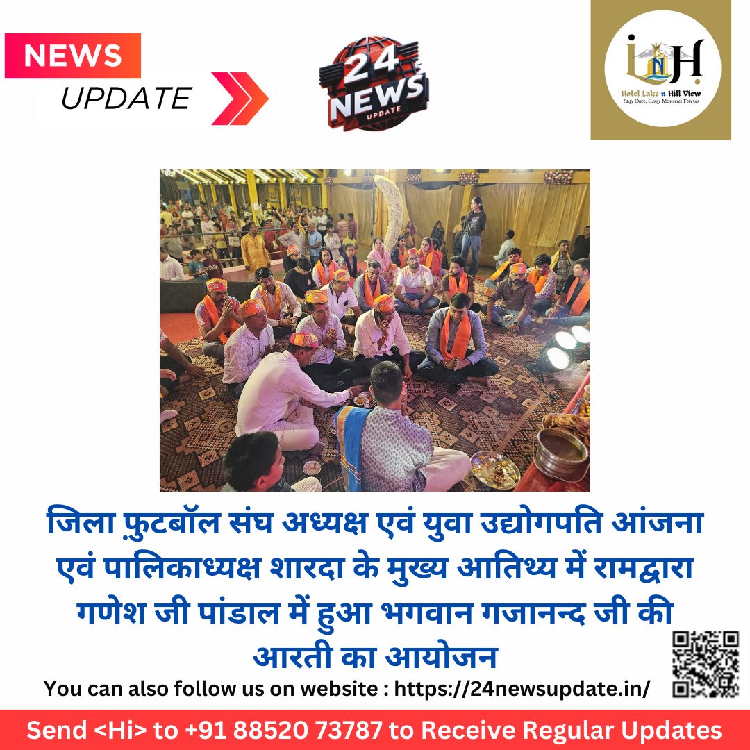 कविता पारख 24 न्यूज़ अपडेट निम्बाहेड़ा। निंबाहेड़ा नगर में यहां अनंत चतुर्दशी के उपलक्ष्य में गणेशोत्सव के दसवें दिन यहां माल गोदाम रोड पर नेहरू पार्क के सामने रामद्वारा गणेश पांडाल में सोमवार को नगरपालिका अध्यक्ष सुभाष शारदा एवम् जिला फ़ुटबॉल संघ अध्यक्ष एवं युवा उद्योगपति पूरण आंजना तथा कोषाध्यक्ष व पार्षद मनोज पारख के मुख्य आतिथ्य में एवं पार्षद रोमी पोरवाल, पूर्व पार्षद माणक लाल साहू, पारस आंजना, देवीलाल आंजना एवं जसपाल आंजना के विशिष्ट आतिथ्य में भगवान श्री गजानन्द जी की आरती का आयोजन हुआ। अतिथियों ने विधिवत भगवान श्री गणेश जी की पूजा अर्चना व आरती कर क्षेत्र में सुखदृसमृद्धि व खुशहाली की प्रार्थना की। प्रारम्भ में अतिथियों के रामद्वारा गणेश पांडाल में पहुंचने पर श्री रामद्वारा गणेश उत्सव सेवा समिति के पदाधिकारीयों ने मेवाड़ी पगड़ी पहनाकर एवं ओपर्णा ओढ़ाकर उनका आत्मीय स्वागत एवं अभिनंदन किया।इस अवसर पर श्री रामद्वारा गणेश उत्सव सेवा समिति के मुकेश माली, विनोद वाथरा सोहन माली, देवेंद्र वाथरा, विजय वाथरा, सुरेश तेली, पूरण कुमावत, जगदीश भांबी, विभोर भांभी, सोहन सालवी, दिलीप चुगवानी, मनोहर माली, मुकेश तेली, सतीश बाबेल, योगेश शर्मा ललित गेरोटिया, बंटी, पवन, प्रकाश वाथरा, यश वाथरा, प्रकाश माली, तनिष्क माली इत्यादि उपस्थित थे आरती के दौरान बड़ी संख्या में क्षेत्रवासीगण तथा भक्तजन मौजूद रहे। आरती समाप्ति के ततपश्चात उपस्थित समस्त भक्तजनों एवम् गणमान्यजनों को आयोजन समिति द्वारा प्रसाद वितरण भी किया गया। Share this: Share on X (Opens in new window) X Share on Facebook (Opens in new window) Facebook More Email a link to a friend (Opens in new window) Email Share on WhatsApp (Opens in new window) WhatsApp Like this:Like Loading... Related Discover more from 24 News Update Subscribe to get the latest posts sent to your email. Type your email… Subscribe Post navigation मध्यप्रदेश के पूर्व गृह मंत्री कोठारी का किया स्वागत पर्युषण पर्व का अंतिम दिवस पर दिगम्बर समाज ने श्री जी के साथ निकाला जलयात्रा जुलुस’