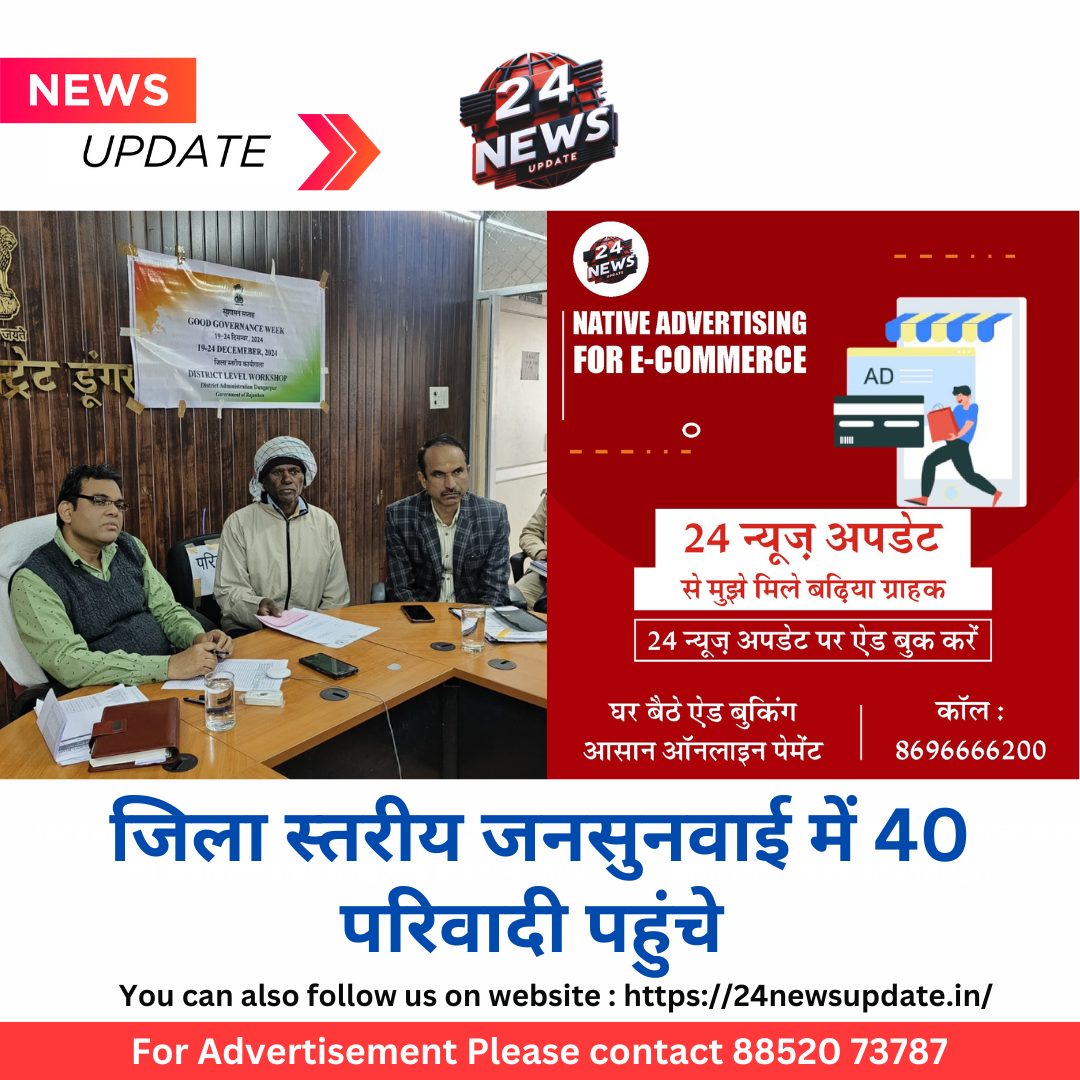 24 न्यूज़ अपडेट डूंगरपुर। जिला कलक्टर अंकित कुमार सिंह के निर्देश पर अतिरिक्त जिला कलक्टर दिनेश धाकड़ ने गुरुवार को जिला स्तरीय जनसुनवाई की। जिला स्तरीय जनसुनवाई में कुल 40 परिवेदनाएं प्राप्त हुई। बसु पिता देवा माण्डवा खापरड़ा निवासी पंचायत समिति दोवड़ा के जमाबंदी में नाम बसु की जगह वसु होने पर सही नाम करवाने की परिवेदना मिलने पर तहसीलदार दोवड़ा से जानकारी लेकर नियमानुसार नाम संशोधन करने के निर्देश दिए। वहीं, मोहनलाल रोत ग्राम पंचायत वलोता पंचायत समिति दोवड़ा में वन अधिकार दस्तावेज में नाम संशोधन करवाने के संबंध में प्राप्त परिवेदना पर तहसीलदार से जानकारी लेकर नियमानुसार संशोधन करने के निर्देश दिए। तहसील क्षेत्र आसपुर की ग्राम पंचायत सकानी में नाला बंद होने से किसानों के खेतों में पानी भरने की परिवेदना पर अतिरिक्त जिला कलक्टर ने तहसीलदार को मौके पर जाकर जांच कर कार्यवाही करने के निर्देश दिए। जिला स्तरीय जनसुनवाई में पीएम किसान सम्मान योजना, भूमि आवंटन, मुख्यमंत्री दुर्घटना बीमा योजना, मुख्यमंत्री चिरंजीवी योजना, पटवारी रिपोर्ट, रास्ते से अतिक्रमण हटाने, आयुष्मान भारत योजना, आधार कार्ड, सीसी सड़क की गुणवत्ता जांच, उप स्वास्थ्य केन्द्र के लिए भूमि आवंटन, स्कूल में रसोई घर स्वीकृत करवाने, छात्रवृत्ति दिलवाने जैसी समस्याओं को लेकर आमजन पहुंचे। अतिरिक्त जिला कलक्टर ने सभी जिला स्तरीय एवं ब्लॉक स्तरीय अधिकारियों को सम्पर्क पोर्टल पर दर्ज शिकायतों का गुणवत्तापूर्ण निस्तारण करने के निर्देश दिए। इस दौरान जिला परिषद सीईओ हनुमान सिंह राठौड़ सहित सभी जिला स्तरीय अधिकारी उपस्थित रहे। ब्लॉक लेवल के सभी अधिकारी वीसी के माध्यम से जिला स्तरीय जनसुनवाई में शामिल हुए। Share this: Share on X (Opens in new window) X Share on Facebook (Opens in new window) Facebook More Email a link to a friend (Opens in new window) Email Share on WhatsApp (Opens in new window) WhatsApp Like this:Like Loading... Related Discover more from 24 News Update Subscribe to get the latest posts sent to your email. Type your email… Subscribe Post navigation बांसवाड़ा में 11 दिन में 11 लाख हनुमान चालीसा पाठ एस्कोर्ट सर्विस के नाम पर ऑनलाइन ठगी करने वाले 3 बदमाश गिरफ्तार