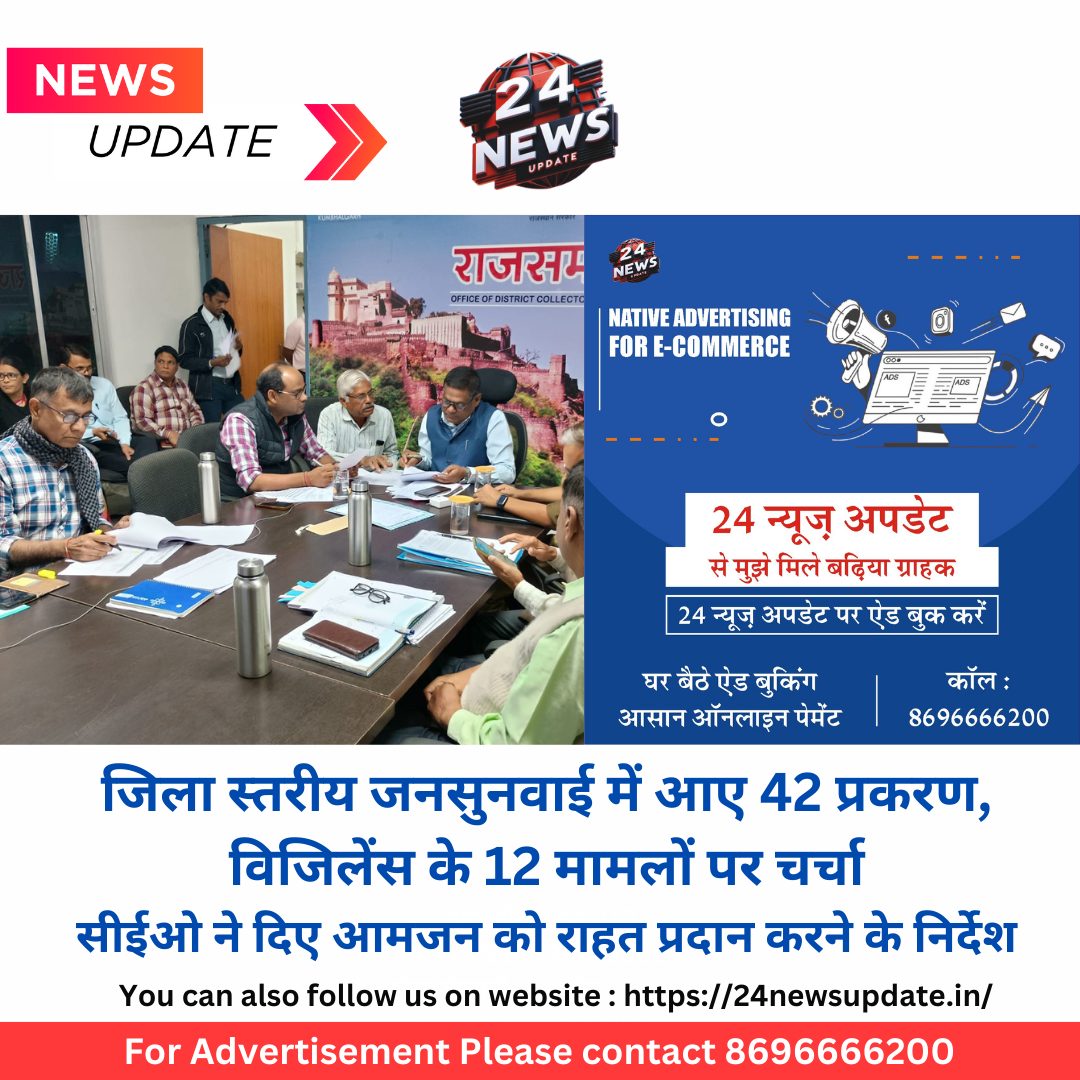 जनसुनवाई में कुल 42 प्रकरण सामने आए तो वही जिला सतर्कता समिति के 12 प्रकरणों पर भी चर्चा हुई। जनसुनवाई में राजस्थान संपर्क पोर्टल और अन्य माध्यमों से प्राप्त लंबित परिवादों की प्रगति रिपोर्ट प्रस्तुत की गई। साथ ही, संभावित प्रकरणों को पहले से चिन्हित कर संबंधित परिवादियों को शिविर में आमंत्रित किया गया था। एकाधिक विभागों के समन्वय से समाधान हेतु चिन्हित प्रकरणों पर भी विशेष ध्यान दिया गया।