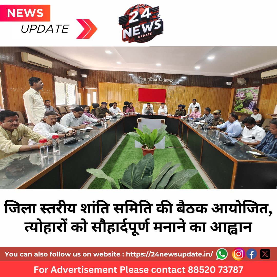 24 न्यूज़ अपडेट चित्तौड़गढ़, 11 मार्च। जिले में आगामी त्योहारों के शांतिपूर्ण आयोजन को सुनिश्चित करने के लिए मंगलवार को जिला स्तरीय शांति समिति की बैठक आयोजित की गई। यह बैठक जिला ग्रामीण विकास अभिकरण सभागार में जिला कलक्टर आलोक रंजन और जिला पुलिस अधीक्षक सुधीर जोशी की अध्यक्षता में संपन्न हुई।