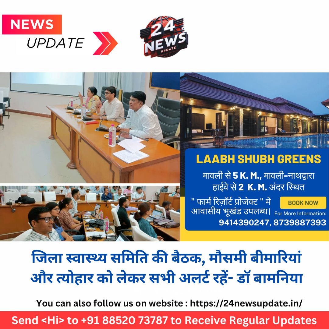24 न्यूज़ अपडेट उदयपुर, मुख्य चिकित्सा एवं स्वास्थ्य अधिकारी डॉ शंकर एच बामनिया ने बताया कि आज जिला कलेक्टर महोदय के निर्देशानुसार जिला परिषद सभागार में जिला स्वास्थ्य समिति की बैठक आयोजित की गई जिसमें सीएमएचओ, एडिशनल सीएमएचओ, आरसीएचओ ,डीपीसी डीडीडब्ल्यू,डीपीएम,यूपीएम,डीएनओ,डीएएम, बीसीएमओ, बीपीएम और जिले के सीएचसी प्रभारियों ने भाग लिया।