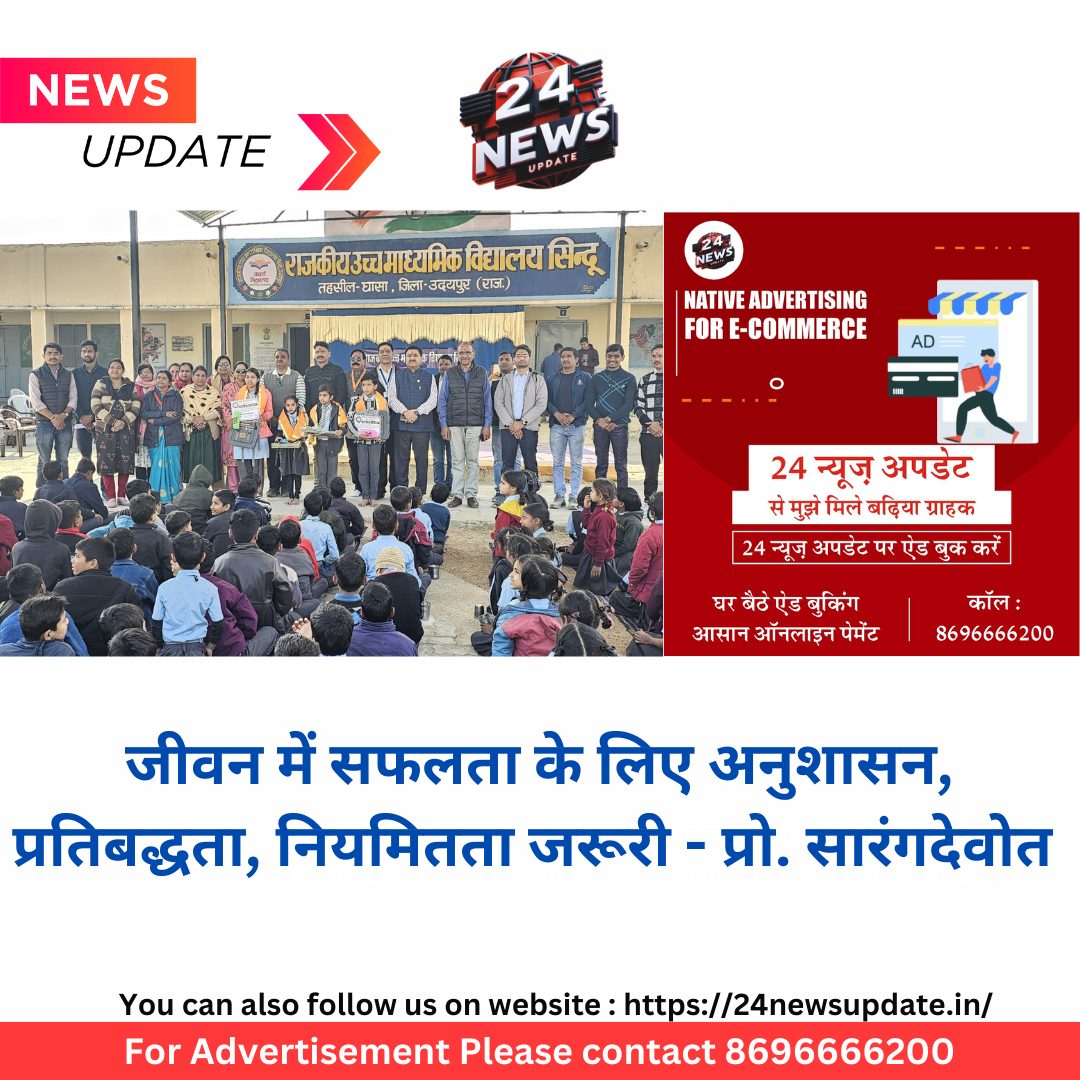 शिक्षाविद् कुलपति कर्नल प्रो. सारंगदेवोत ने उत्कृष्ट 23 बालिकाओं को साईकिल का किया वितरण-विद्यापीठ सिन्दू उच्च माध्यमिक विद्यालय को लेगा गोद उदयपुर 11 दिसम्बर ध् जीवन में अनुशासन, प्रतिबद्धता और नियमितता के माध्यम से हर मुकाम पर पहुंचा जा सकता है, इसके लिए इच्छा शक्ति का होना अनिवार्य है। उक्त विचार बुधवार को राजकीय उच्च माध्यमिक विद्यालय सिन्दू में उत्कृष्ट विद्यार्थियों को निशुल्क साईकिल वितरण समारोह में राजस्थान विद्यापीठ के कुलपति कर्नल प्रो. शिवसिंह सारंगदेवोत ने बतौर मुख्य अतिथि कही। उन्होंने कहा कि हम किसी भी मुकाम पर पहुंच जाये हमें अपनी भारतीय संस्कृति, परम्परा को नहीं भूलना है। विद्यापीठ सिन्दू विद्यालय को गोद लेगा और साहित्यिक, खेलकूद एवं अकादमिक गुणवत्ता को बढ़ाने में अपना सहयोग देगा। विद्यापीठ में अध्ययन करने वाली बालिका को फीस में 50 प्रतिशत की छूट एवं निरूशुल्क पुस्तकें उपलब्ध कराई जायेगी।प्रारंभ में प्रधानाचार्य उमेश माहेश्वरी ने अतिथियों का स्वागत करते हुए समारोह की जानकारी देते हुए बताया कि राज्य सरकार की योजना के अनुसार 23 बालिकाओं को साईकिल का वितरण किया जा रहा है। माहेश्वरी ने विद्यालय का प्रतिवेदन भी प्रस्तुत किया।अध्यक्षता करते कुल पूर्व सरपंच एवं कुल प्रमुख भंवर लाल गुर्जर ने विद्यार्थियों का आव्हान किया कि आप सभी देश की भावी पीढ़ी है अतः पूरी ईमानदारी के साथ आगे बढ़ना है। उन्होंने कहा कि ग्राम पंचायत गांव में जगह उपलब्ध करायेगी तो विद्यापीठ द्वारा महाविद्यालय भी खोलने का प्रस्ताव ले सकती है।इस अवसर पर विद्यालय की बालिकाओं द्वारा राजस्थानी गीतों पर सांस्कृतिक प्रस्तुतियां दी गई। कार्यक्रम का संचालन सुरेश टांक ने किया। इस अवसर पर पुष्कर मालवीय, रमेश पटेल, ज्योति कुमावत, नीलू अग्रवाल सहित विद्यालय के विद्यार्थी सहित गांव के प्रबुद्धजन उपस्थित थे। Share this: Share on X (Opens in new window) X Share on Facebook (Opens in new window) Facebook More Email a link to a friend (Opens in new window) Email Share on WhatsApp (Opens in new window) WhatsApp Like this:Like Loading... Related Discover more from 24 News Update Subscribe to get the latest posts sent to your email. Type your email… Subscribe Post navigation राजस्थान पावरलिफ्टिंग टीम की घोषणा विद्यापीठ – वार्षिकोत्सव 2024, रंगारंग प्रस्तुतियों के साथ हुआ आगाज राजस्थानी, पंजाबी, रिमिक्स गानों पर जमकर दी प्रस्तुतियाॅ, भगवान राम के जीवन पर प्रस्तुत नृत्य नाटिका ने सभी का मन मोहा उत्कृष्ट विधार्थियों का किया सम्मान, शिक्षक समाज का राॅल माॅडल – प्रो सारंगदेवोत