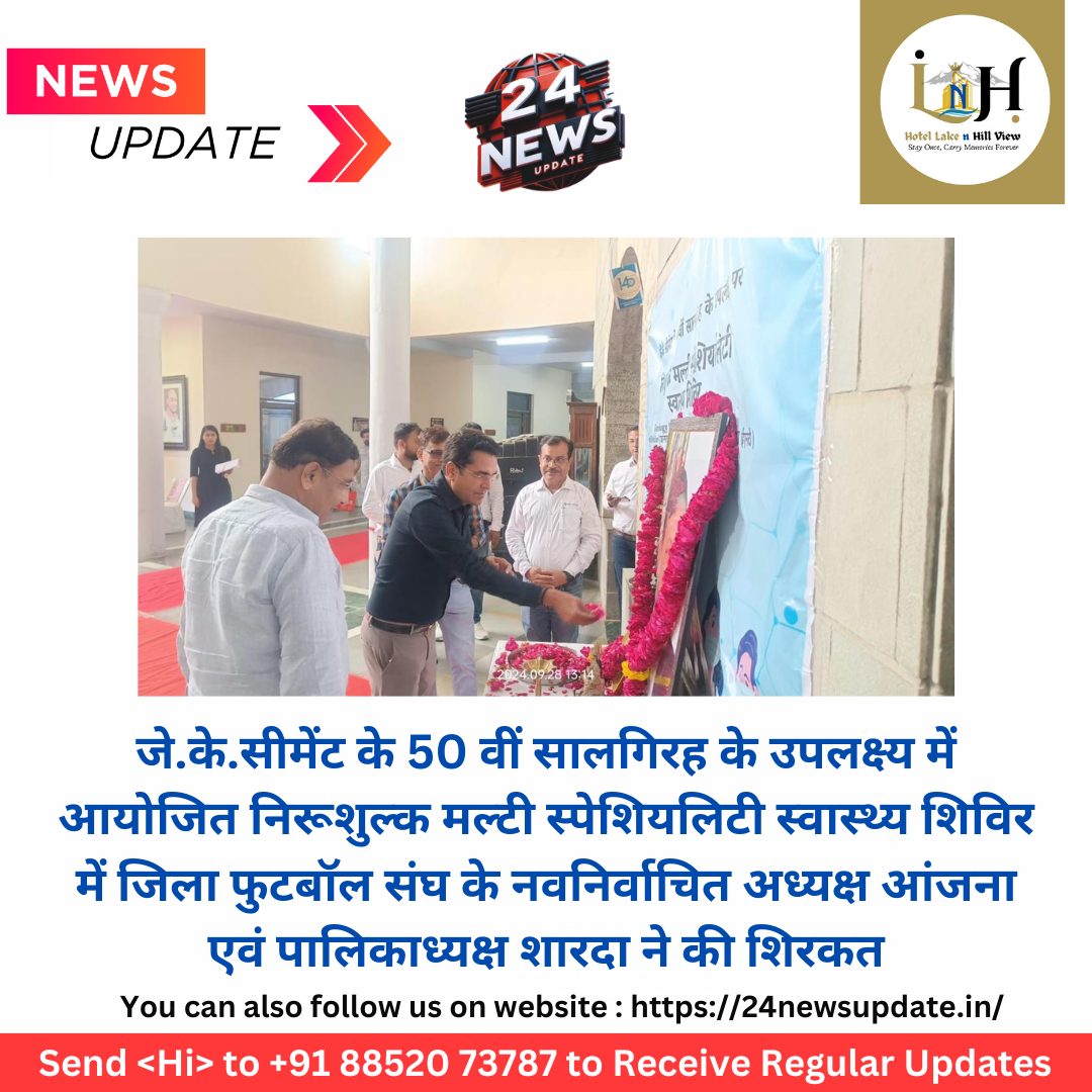 उक्त आयोजन के प्रथम दिन नगर पालिका अध्यक्ष सुभाष चंद्र शारदा एवं जिला फुटबाल संघ के नवनिर्वाचित अध्यक्ष व युवा उद्योगपति पूरण आंजना ने शिविर में शिरकत कर जेके सीमेंट कंपनी के पूर्व डायरेक्टर स्व.यदुपति सिंघानिया की तस्वीर पर माल्यार्पण एवं पुष्पांजलि अर्पित कर समाज सेवा एवं जन सेवा के क्षेत्र में उनके उल्लेखनीय योगदान को याद किया। इस अवसर पर जेके सीमेंट यूनिट हेड मनीष तोषनीवाल, एच आर हेड प्रभाकरण मिश्रा एवं सी आर एस हैड मनीष शर्मा आदि उपस्थित थे।
