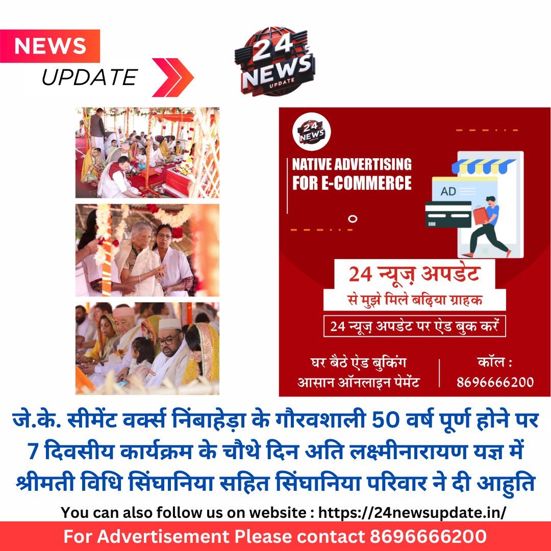 24 न्यूज़ अपडेट निम्बाहेडा। जे.के. सीमेंट वर्क्स निंबाहेड़ा के गौरवशाली 50 वर्ष पूर्ण होने पर आयोजित होने वाले कार्यक्रमों के चोथे दिन अति लक्ष्मी नारायण यज्ञ में अम्मा जी श्रीमती सुशीला सिंघानिया ने दी यज्ञ में आहुति (पुष्प अर्पण), निधिपति सिंघानिया,विधि सिंघानिया , जे.के. सीमेंट के प्रबंध निदेशक डॉ. राघवपत सिंघानिया एवं सिंघानिया परिवार यज्ञ आहुतियां में हुआ शामिल। इस अवसर पर जे.के. सीमेंट समूह के डॉ. कौस्तुभ दाधीच, निंबाहेड़ा यूनिट हेड मनीष तोषनीवाल, एचआर हेड प्रभाकर मिश्रा, टेक्निकल हेड राजेश सोनी, कमर्शियल हेड अजय गर्ग, माइंस हेड यतेंद्र शर्मा सहित कई अधिकारी गण भी थे मौजूद !