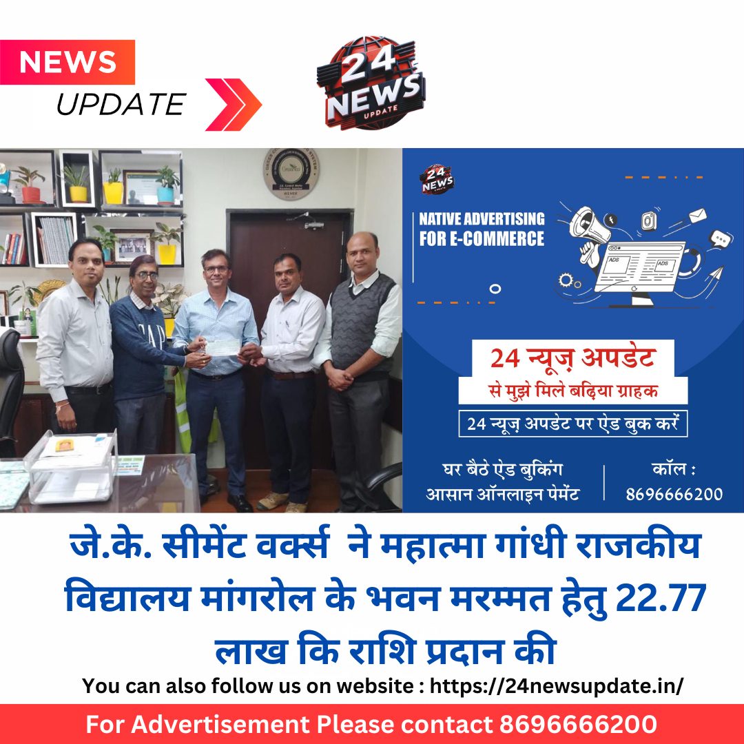 24 न्यूज अपडेट निंबाहेड़ा, जे.के. सीमेंट वर्क्स निंबाहेडा ने अपने सामाजिक सरोकार एवं क्षेत्र के विकास में अपनी भूमिका और सी आर के तहत महात्मा गांधी राजकीय विद्यालय मांगरोल में भवन मरम्मत हेतु 22 लाख 77 हजार रुपए की राशि का चेक जे.के. सीमेंट के यूनिट हेड मनीष तोषनीवाल ने पंचायत प्रारम्भिक शिक्षा अधिकारी मांगरोल दिलीप हिंगड़ व महात्मा गांघी राजकीय विद्यालय के स्टाफ सदस्य अमृत प्रजापति को प्रदान किया।