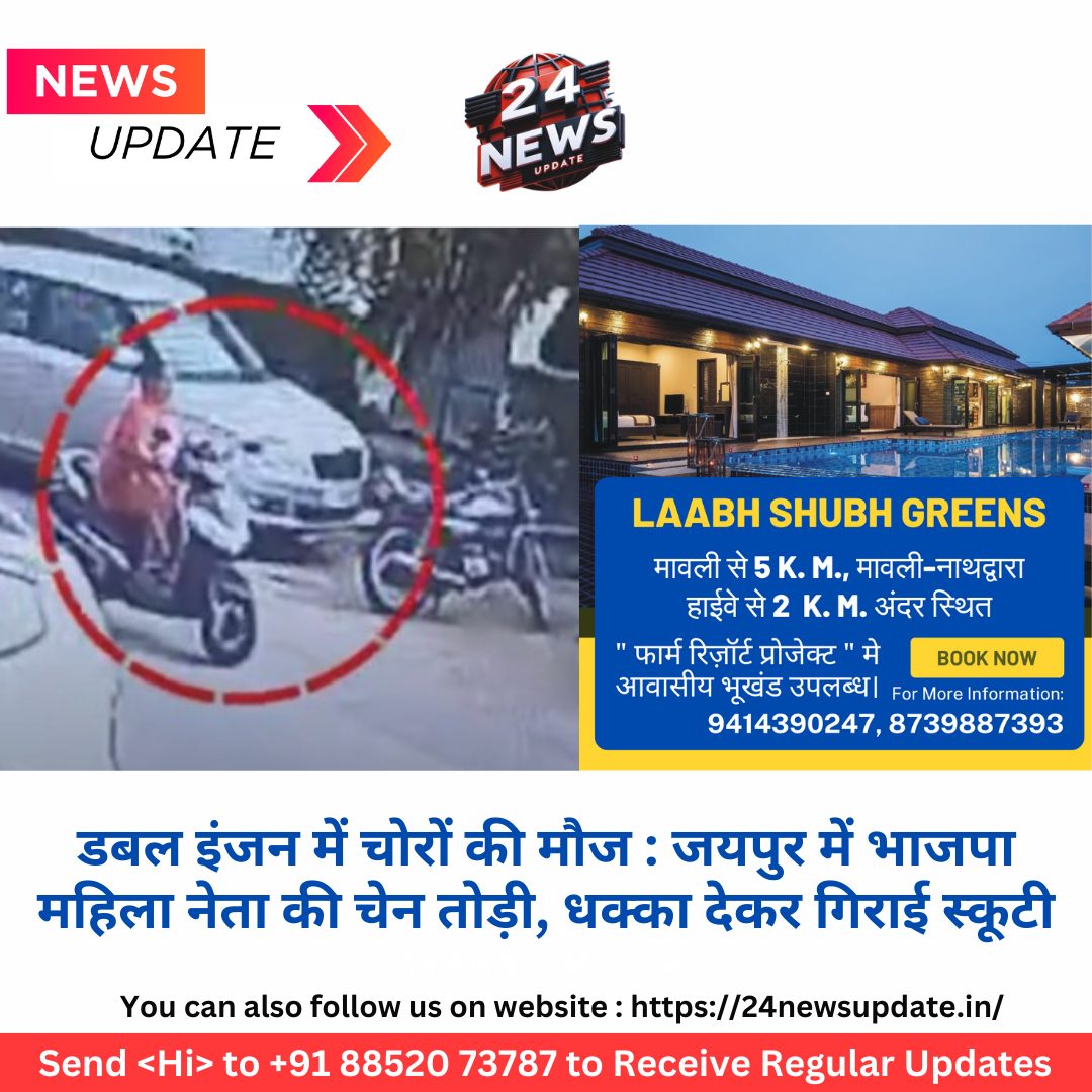 24 न्यूज अपडेट. जयपुर। चोरों की सीनाजोरी बढ़ती ही जा रही है। वे ना तो सत्ता पक्ष वालों को छोड़ रहे हैं ना विपक्षियों को। धड़ल्ले से बेखौफ अपराध डबल इंजन की सरकार में हो रहे हैं। जयपुर के विद्याधर नगर इलाके में बाइक सवार बदमाश ने बीजेपी की महिला नेता की चेन तोड़ ली जो स्कूटी पर जा रही थी। बाइक पर पीछे से आए बदमाश ने चलती स्कूटी से महिला के गले से चेन छीन ली और धक्का दे दिया। हाथ-पैर में उनको चोट लगी। बदमाशों ने उनके हीरे के पेंडेंट वाली करीब ढाई लाख की सोने की चेन तोड़ दी। घटना का सीसीटीवी फुटेज भी सामने आया है। महिला की शिकायत पर विद्याधर नगर थाना पुलिस ने एफआईआर दर्ज कर जांच शुरू कर दी है। स्कूटी पर सवार महिला का लगातार पीछा कर रहा था व मौका देखते ही वारदात कर ली। पीड़िता राजुल तापड़िया (45) पत्नी महेंद्र कुमार तापड़िया ने बताया कि स्थानीय महिला मोर्चा विद्याधर नगर में मंत्री है। पार्षद प्रियंका के पास मीटिंग कर रावणा राजपूत बिल्डिंग के पास से होती हुई 10 स्क्वायर मॉल अपने ऑफिस जा रही थी। इस दौरान स्कूटी के पीछे से बाइक सवार युवक आया। बदमाश ने हेलमेट पहन रखा था। स्कूटी स्पीड ब्रेकर के पास आई ओर बदमाश ने साड़ी में लिपटी हुई सोने की चेन तोड़ ली। स्कूटी का बैलेंस बिगड़ा और सड़क पर गिर गई। लोगों ने संभाला। दो युवकों ने पीछा किया, लेकिन वह हाथ नहीं आया। राजुला के पति महेंद्र कुमार ने पुलिस को रिपोर्ट दी है।