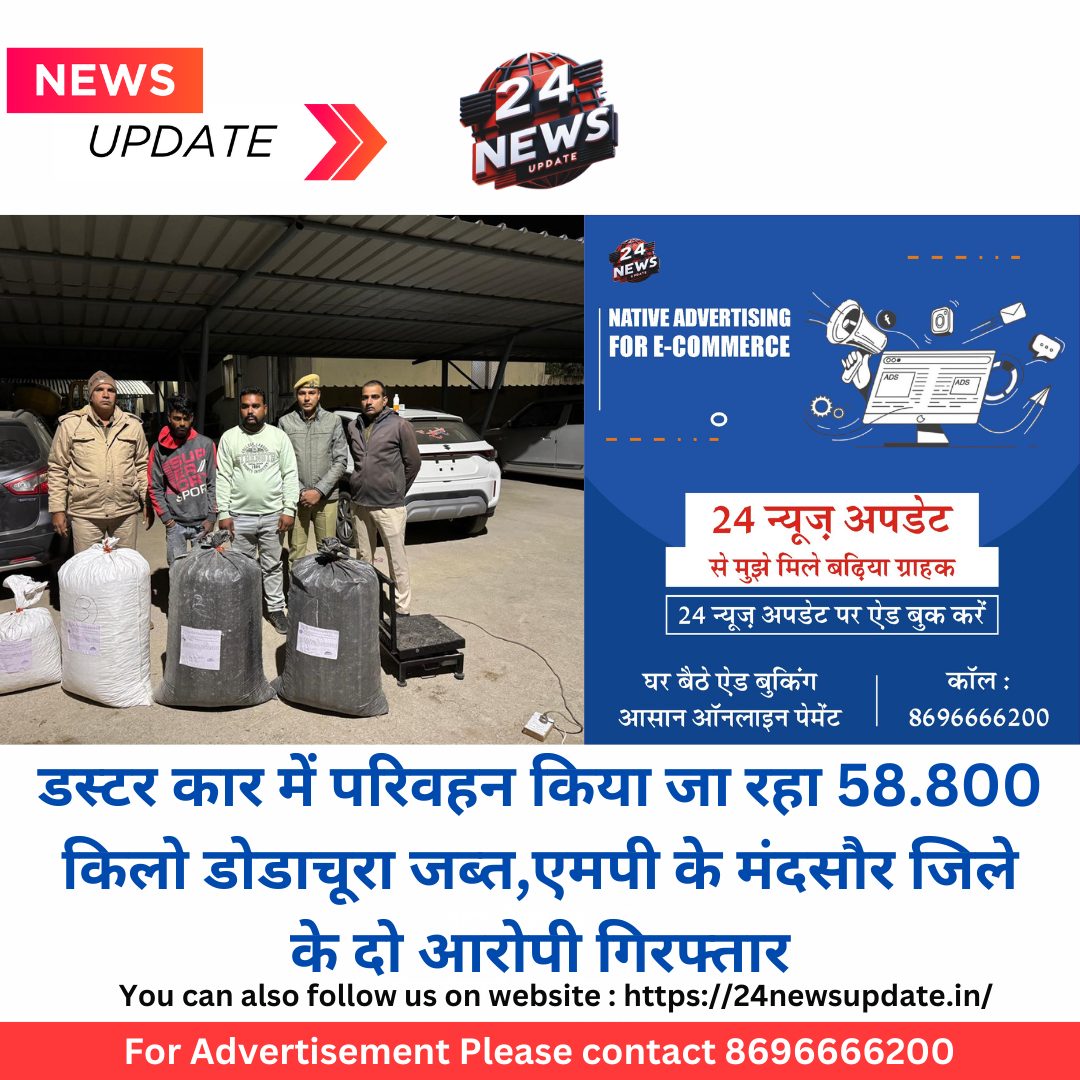 24 न्यज अपडेट निम्बाहेडा। जिले की सदर निम्बाहेड़ा थाना पुलिस ने शुक्रवार को थाना क्षेत्र में गश्त के दौरान एक डस्टर कार में अवैध रूप से परिवहन किया जा रहा 58 किलो 800 ग्राम डोडाचूरा जब्त कर मंदसौर के दो आरोपीयों को गिरफ्तार किया है।