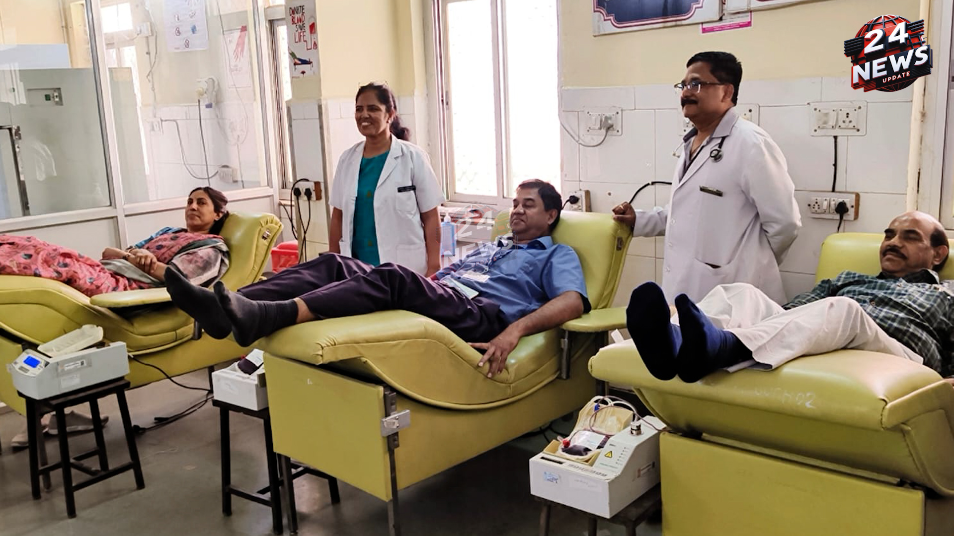 24 न्यूज अपडेट उदयपुर। विश्व डॉक्टर्स डे पर एमबी अस्पताल के ब्लड बैंक में रक्तदान शिविर का आयोजन किया गया। इस शिविर के दौरान गायनिक विभाग के सभी डॉक्टर एस रेजिडेंट डॉक्टर्स और स्टाफ ने मिलकर रक्तदान किया रक्तदान। शिविर के दौरान गायनिक विभाग की अध्यक्ष डॉक्टर सुधा गांधी ने बताया कि रक्त की सबसे ज्यादा कमी महिलाओं में देखने को मिलती है जब प्रेगनेंसी के दौरान महिलाएं एमबी अस्पताल पहुंचती है तो कई महिलाएं ऐसी होती है जिनमें ब्लड की कमी होती है और उन्हें अतिरिक्त रक्त चढ़ाया जाता है इसी वजह से उदयपुर में आज डॉक्टर्स डे के मौके पर यह रक्तदान शिविर का आयोजन किया गया है जिससे दूसरे लोगों में भी ब्लड डोनेशन के प्रति जागरूकता आए आमतौर पर महिलाओं के साथ आने वाले परिवार के सदस्य बल्ड डोनेशन के नाम पर घबराते हैं. जिससे कई महिलाओं की मौत तक हो जाती है इन महिलाओं को बचाने के लिए इस खास शिविर का आयोजन किया गया है, शिविर के दौरान करीब 51 यूनिट रक्तदान किया गया।