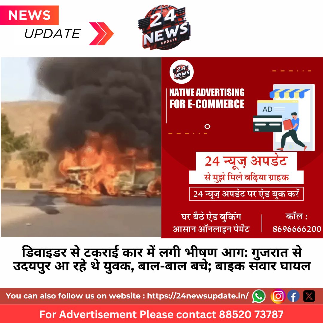 24 News Update उदयपुर | उदयपुर-पिंडवाड़ा नेशनल हाईवे पर सोमवार दोपहर एक तेज रफ्तार कार डिवाइडर से टकरा गई, जिससे उसमें अचानक आग लग गई। हादसे के वक्त कार में सवार गुजरात के मेहसाणा जिले के तीन युवक समय रहते बाहर निकल आए, जिससे उनकी जान बच गई। वहीं, टक्कर की चपेट में आए एक बाइक सवार युवक को चोटें आई हैं, जिसे हाईवे एम्बुलेंस की मदद से हॉस्पिटल भिजवाया गया।हादसा गोगुंदा क्षेत्र में बायण माता मंदिर के सामने कट पर हुआ, जहां एक अनियंत्रित कार ने पहले बाइक को टक्कर मारी और फिर सीधे डिवाइडर से जा भिड़ी। टक्कर इतनी जबरदस्त थी कि कुछ ही पलों में कार में आग लग गई। गनीमत यह रही कि कार के दरवाजे लॉक नहीं हुए, वरना बड़ा हादसा हो सकता था।लोगों ने बचाया सामान, पर नहीं बच सकी कारप्रत्यक्षदर्शियों के अनुसार, कार में सवार युवकों का काफी सामान भी था। कार से बाहर निकलने के बाद उन्होंने मदद के लिए आवाज लगाई। आसपास मौजूद लोगों ने तुरंत मदद करते हुए जलती कार से सामान बाहर निकाला, लेकिन तब तक आग विकराल रूप ले चुकी थी। देखते ही देखते पूरी कार धू-धू कर जल गई।स्थानीय लोगों ने फायर स्टेशन को सूचना दी, लेकिन उससे पहले ही आसपास से पानी के टैंकर मंगवाकर आग बुझाने की कोशिश की गई। बावजूद इसके कार पूरी तरह खाक हो गई।बाइक सवार घायल, हाईवे पर लगी भीड़हादसे में घायल बाइक सवार को स्थानीय लोगों ने एम्बुलेंस बुलाकर अस्पताल भिजवाया। घटना के बाद नेशनल हाईवे पर लंबा जाम लग गया और वहां बड़ी संख्या में लोग जमा हो गए। पुलिस और हाईवे पैट्रोलिंग टीम ने मौके पर पहुंचकर यातायात बहाल करवाया।यात्रियों की किस्मत ने दी साथकार में सवार तीनों युवक गुजरात से उदयपुर घूमने आ रहे थे। हादसे के समय उनकी सतर्कता और समय पर बाहर निकल पाने की वजह से बड़ा हादसा टल गया। फिलहाल पुलिस ने दुर्घटना की जांच शुरू कर दी है। Share this: Share on X (Opens in new window) X Share on Facebook (Opens in new window) Facebook More Email a link to a friend (Opens in new window) Email Share on WhatsApp (Opens in new window) WhatsApp Like this:Like Loading... Related Discover more from 24 News Update Subscribe to get the latest posts sent to your email. Type your email… Subscribe Post navigation सिस्टम की रगों में रिश्वतः पुलिस से पटवारी, दलाल से डॉक्टर तक, 245 भ्रष्ट कर्मचारियों ने किया प्रशासन को शर्मसार, पिछले साल रिश्वतखोरी में पुलिस नंबर-1 श्री श्याम महोत्सव में सात साल बाद 10 मई को उदयपुर में भजनों की प्रस्तुति देंगे नंदू महाराज