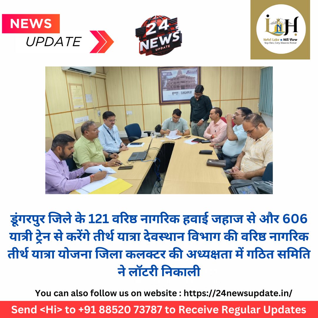24 न्यूज़ अपडेट डूंगरपुर। देवस्थान विभाग की वरिष्ठ नागरिक तीर्थ यात्रा के तहत पंजीकृत आवेदकों की फाइनल लॉटरी शनिवार को जिला कलक्टर अंकित कुमार सिंह की अध्यक्षता में गठित कमेटी की मौजूदगी में निकाली गई। एनआईसी कार्यालय में डीओआईटी के कंप्यूटराइज्ड सॉफ्टवेयर के माध्यम से लॉटरी निकाली गई। देवस्थान विभाग, ऋषभदेव के निरीक्षक शिवराज सिंह राठौड़ ने बताया कि हवाई यात्रा के लिए कुल 2178 एवं रेल यात्रा के लिए 2177 आवेदन प्राप्त हुए। निर्धारित कोटा अनुसार 121 हवाई यात्रा व 606 यात्री रेल यात्रा की मुख्य सूची के लिए चयनित हुए। इसके बाद प्रतीक्षा, अतिरिक्त प्रतीक्षा सूची भी जारी की गई है, जिसे देवस्थान विभाग के पोर्टल पर जाकर देखा जा सकता है। उन्होंने बताया कि एक ही आवेदन में पति-पत्नी सहायक भी हो सकते हैं। उपलब्ध कोटे के अलावा प्रतीक्षा सूची भी निकाली गई है। चयनित आवेदकों के यात्रा में शामिल नहीं होने पर प्रतीक्षा सूची में शामिल यात्रियों को अवसर दिया जाएगा। इस दौरान सीएमएचओ डॉ. अलंकार गुप्ता, जिला परिषद सीईओ हनुमान सिंह राठौड़ सहित अन्य अधिकारी उपस्थित रहे।