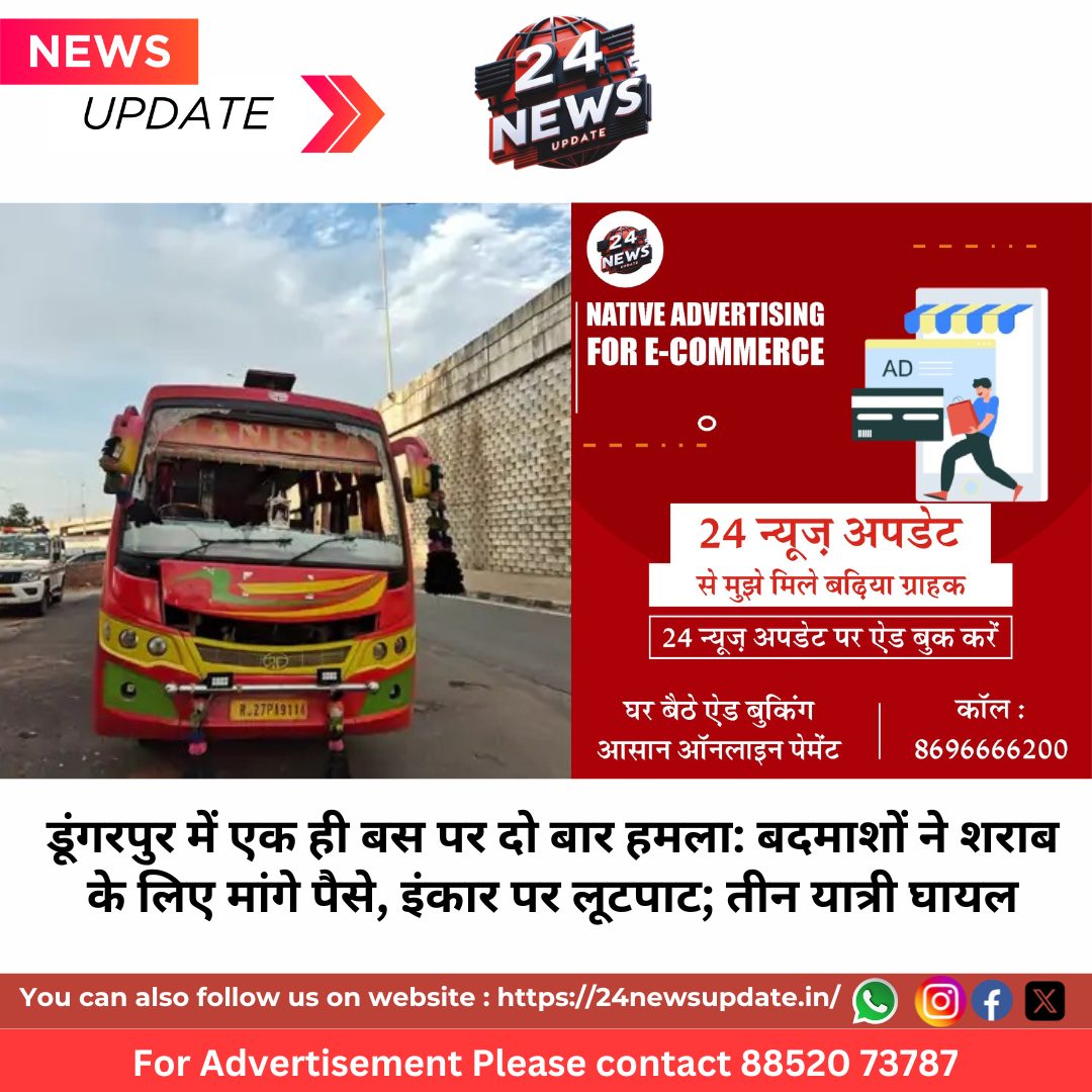 24 News Update डूंगरपुर | राजस्थान के डूंगरपुर जिले से एक हैरान कर देने वाली घटना सामने आई है, जहाँ एक ही बस को 12 घंटे के भीतर दो बार अपराधियों ने निशाना बनाया। शराब के लिए पैसे मांगे, इंकार किया तो 24,500 रुपये लूट लिए बस के मालिक विजय गरासिया के मुताबिक, 12 मई को वह बेणेश्वर धाम से यात्रियों को लेकर लौट रहे थे। जैसे ही बस पाटिया थाना क्षेत्र के गंगानगर पहुंची, दो मोटरसाइकिलों पर सवार तीन बदमाशों ने रास्ता रोका। बदमाशों ने बस रुकवाई और सीधे शराब के लिए पैसे मांगने लगे। जब इंकार किया गया, तो उन्होंने बस में चढ़कर मारपीट शुरू कर दी और जेब से ₹24,500 छीन लिए। शोर मचने पर आरोपी बाइक छोड़कर भाग निकले। पुलिस को बाद में दोनों बाइकें सौंप दी गईं और मामला दर्ज करवाया गया। अगले दिन 13 मई को, विजय देव सोमनाथ की ओर यात्रियों को लेकर जा रहे थे। मोदर गांव के पास बस जैसे ही पहुंची, वहां पहले से खड़े 15 बदमाशों ने लट्ठ और पत्थरों से बस पर धावा बोल दिया। हमलावरों ने सभी कांच तोड़ डाले और ‘रूट पर चलने के लिए हफ्ता’ मांगा। मना करने पर वे बस में घुस गए और लगभग 30 यात्रियों से मारपीट करते हुए नकदी और कीमती सामान लूट लिया। इस हमले में एक महिला सहित तीन यात्रियों को गंभीर चोटें आईं। यात्रियों में दहशत फैल गई। घायल यात्रियों का इलाज चल रहा है। घटना का वीडियो भी सामने आया है, जिसके आधार पर पुलिस अब आरोपियों की तलाश में जुट गई है।