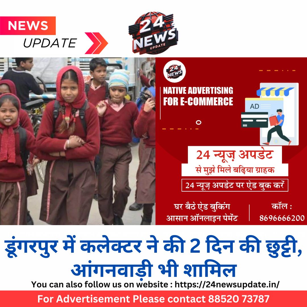 24 न्यूज अपडेट. डूंगरपुर। जिला कलेक्टर के आदेश जारी कर सभी सरकारी और निजी स्कूलों में कक्षा 1 से 8 तक के बच्चों के लिए 15 और 16 जनवरी को अवकाश घोषित कर दिया है। कलेक्टर के आदेश के अनुसार सभी सरकारी और निजी स्कूलों में कक्षा 1 से 8 तक के स्टूडेंट्स के लिए 15 और 16 जनवरी को अवकाश घोषित किया है। शीतलहर को देखते हुए कलेक्टर अंकित कुमार सिंह ने मंगलवार को यह आदेश जारी किया है। आंगनवाड़ी केंद्रों और मां-बाड़ी केंद्रों में भी छुट्टी रहेगी।यह छुट्टी केवल छात्र-छात्राओं के लिए है। शिक्षकों को स्कूल में उपस्थित रहना होगा और स्कूल निर्धारित समय तक खुले रहेंगे।