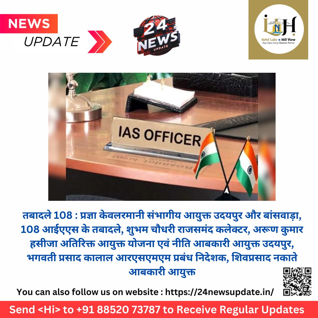 24 न्यूज अपडेट. उदयपुर। प्रदेश में आज सुबह बड़ा प्रशासनिक फेरबदल हुआ है। अल सुबह 108 आईएएस अफसरों के तबादले किये गए जबकि, 20 प्।ै अफसरों को अतिरिक्त चार्ज दिया गया है. इसको लेकर कार्मिक विभाग ने आदेश जारी किए है। कार्मिक विभाग ने एक आदेश जारी करके 108 आईएएस अफसरों का तबादला किया है, जबकि 20 आईएएस अफसरों को अतिरिक्त चार्ज दिया गया है।