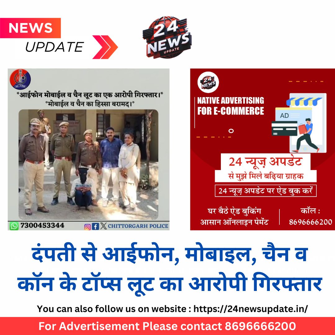 24 न्यूज अपडेट चित्तौड़गढ़। कपासन थाना क्षेत्र में हाईवे पर मोटर साईकिल सवार दंपती को रूकवा कर महिला से आईफोन मोबाईल, चैन व कान के टॉप्स लूट के मामले में कपासन थाना पुलिस ने एक आरोपी को गिरफ्तार किया है। आरोपी से लूटा गया एप्पल कम्पनी का मोबाईल एंव सोने की चैन का एक हिस्सा बरामद किया गया है। गिरफतार आरोपी उच्च दर्ज का बदमाश होकर पूर्व में लूट एवं शराब तस्करी के मामलों में लिप्त रह चुका है। जिला पुलिस अधीक्षक श्री सुधीर जोशी ने बताया कि गत 14 अक्टूबर को दोपहर एक महिला अपने पति के साथ आर.एन.टी कॉलेज कपासन से अपने घर कांकरिया जा रही थी। कपासन में हाई वे के पास में स्थित दुर्गा माता मन्दिर के पास पहुंचे, तो पीछे से दो जवान उम्र के व्यक्ति मोटर साईकिल लेकर आये और उनकी मोटर साईकिल के आडे लगा उन्हें रूकवा कर दोनों ने उसे व उसके पति को चाकु दिखा डरा धमका कर उसका मोबाईल आईफोन एप्पल एंव उसके गले में पहनी सोने की चैन करीब एक तोला व कान में पहने सोने के टॉप्स करीब तीन ग्राम छीन कर अपनी मोटर साईकिल से भाग गये। जिस पर पुलिस थाना कपासन पर प्रकरण दर्ज कर जांच शुरू की गई।