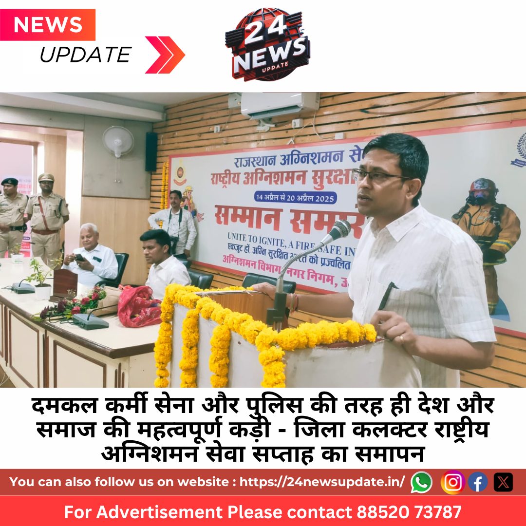 News Update उदयपुर. नगर निगम के अग्निशमन विभाग के तत्वावधान में गत 14 अप्रेल से प्रारंभ हुए राष्ट्रीय अग्निशमन सेवा सप्ताह का समापन समारोह रविवार को नगर निगम सभागार में जिला कलक्टर नमित मेहता तथा उदयपुर शहर विधायक ताराचंद जैन के आतिथ्य में हुआ।कार्यक्रम में उत्कृष्ट सेवाओं के लिए दमकल कर्मियों तथा सहयोगी संस्थानों को सम्मानित किया गया।
