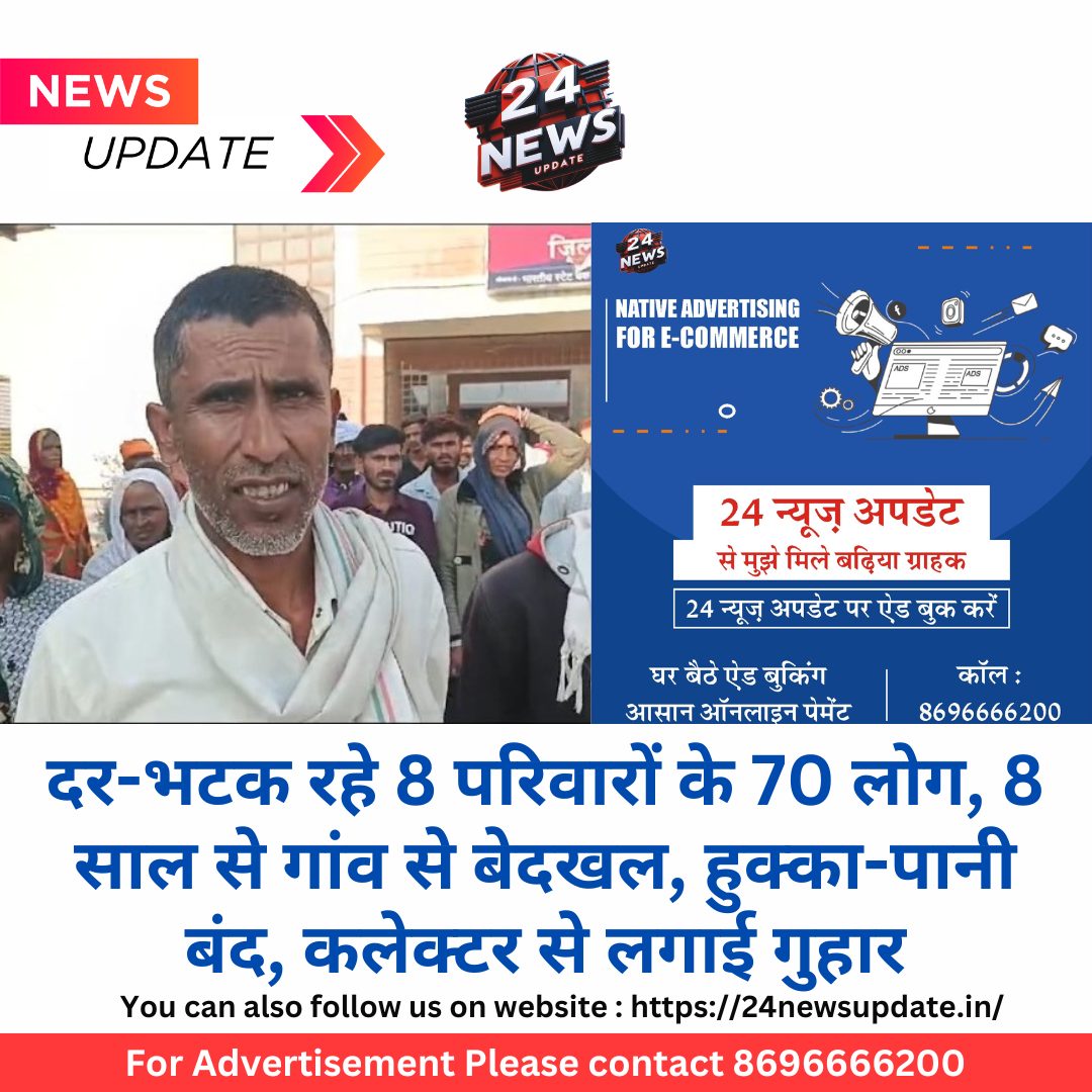 24 न्यूज अपडेट. सलूंबर। सलूंबर के डेलवास में 8 परिवारों के 70 सदस्यों को 8 साल से गांव से बेदखल कर दिया गया है। ये लोग आठ साल से दर-दर भटक रहे हैं। इनका हुक्का-पानी बंद कर दिया है। इनका कहना है कि गांव में इनके घरों को लूट लिया गया है। मानवाधिकारों का हनन हो रहा है। इनको चुनाव में वोट तक नहीं डालने दिया गया। आठ साल से दर-दर भटक रहे ये लोग अब इंसाफ चाहते हैं। अपने गांव में पुनर्वास चाहते हैं। गांव के दबंग लोगों ने इनके परिजन पर हत्या का आरोप लगाया था। आज ये जिला कलेक्टर के पास गुहार लेकर आए हैं। इनका कहना है कि आठ साल तक भटकते हुए इनका पूरा सामाजिक जीवन खत्म हो गया है। बच्चों की पढ़ाई चौपट हो गई है। खेतों पर काम नहीं कर सकते, बाजारों में खरीददारी करने नहीं जा सकते। इनमेंसे कुछ लोग जंगलों में रह रहे हैं तो कुछ रिश्तेदारों घर पर। इनका कहना है कि इन्हें न्याय दिया जाए। इनकी घर वापसी करवाई जाए। ये लोग डेलवास गांव के रहने वाले है। गांव के कुछ लोग परिवार के अन्य सदस्यों को भी प्रताड़ित कर रहे हैं और उन्हें भी गांव छोड़ने पर मजबूर कर रहे है। हाजाराम पिता थावरा ने बताया कि पूर्व में हम प्रार्थीगण को कहा कि तुम्हारा जेवर व सामान हम गांव वालों ने लूट लिया है और तुम्हारा घर खत्म कर दिया है। तुम गांव में नहीं रह सकते हो, तेरे भाई पर व परिवार के सदस्य पर हत्या का मुकदमा चल रहा है जब तक गांव में फैसला नहीं होता तो तुम व तुम्हारे परिवार का कोई भी सदस्य, रिश्तेदार इस गांव में नहीं रह सकते है। गांव के मुखिया हाजाराम पिता थावरा, नारू पिता हाजाराम, प्रभु पिता थावरा, रणछोड पिता कडुआ, गणपत पिता नारा, लोकेश पिता नारू, जितेन्द्र पिता नारू, गोतम पिता शांतिलाल, अमृतलाल पिता प्रभुलाल, राजु मीणा, बदा पिता लालु मीणा, विजयलक्ष्मी पिता बदा मीणा, समस्त जाति मीणा, तमाम निवासीयान डेलवास, तहसील सराडा व अन्य ग्रामवासी इकट्ठे होकर मकान का सामान लूट लिया व तोड़ दिया तथा गांव से निकालने की धमकी देकर प्रताड़ित किया व हमें गांव छोड़ने पर मजबूर किया कर रहे हैं। पूर्व में उक्त व्यक्तियों द्वारा बर्तन, सीमेंट, दरवाजे, खिड़किया, कुएं की मोटर, गेहूं, मक्का, चावल व जेवरात लूट कर ले गये है। उक्त गांव के सभी व्यक्ति लगातार प्रार्थी व परिवार के अन्य सदस्यों को प्रताडित कर रहे है एवं गांव छोडने पर मजबूर कर रहे है। तथा कह रहे हैं कि गणेशलाल के विरूद्ध हत्या का मामला है, इसलिये तुम कोई भी यहां इस गावं में नहीं रह सकते हो और लगातार प्रताडित कर रहे हैं। उनका कहना है कि गणेशलाल ने कोई हत्या नहीं की तथा वह निर्दोष है तथा मुकदमा न्यायालय में विचाराधीन है तथा अन्तिम परिणाम / निर्णय पर स्थिति स्पष्ट हो जाएगी फिर भी उक्त सभी व्यक्ति नहीं मान रहे है तथा हमेशा लड