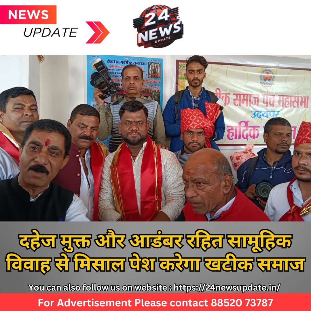 श्री खटीक समाज राष्ट्रीय संगठन के राष्ट्रीय अध्यक्ष आकाश बागडी ने बताया कि संगठन की ओर से समाज का पहला वृहद सामूहिक विवाह समारोह बसंत पंचमी के अवसर पर 2 फरवरी को उदयपुर के फतह स्कूल में संपन्न होगा। इस पहले समारोह में 27 जोडो का रजिस्ट्रेशन हुआ है। इनमें उदयपुर शहर के अलावा आसपास के जिलों तथा गुजरात व मध्यप्रदेश के जोडे भी शामिल है। इस सामूहिक विवाह को लेकर संगठन के पदाधिकारियों के निर्णय व समाज के प्रबुध लोगों की राय पर पूरी तरह दहेज मुक्त रखा गया है। सामूहिक विवाह में शामिल जोडो को किसी प्रकार की दहेज सामग्री नहीं दी जाएगी। इससे संगठन एक मिसाल तो पेश कर रही रहा है, साथ में यह संदेश भी दे रहा है कि दहेज एक बुरी प्रथा है जिसको समाप्त करने का अब समय आ गया है। इसके अलावा आडंबर के रुप में छोटी-मोटी जो रस्में होती है उनको भी बंद किया जाएगा, ताकि परिवारजनों पर आर्थिक भार नहीं हो।