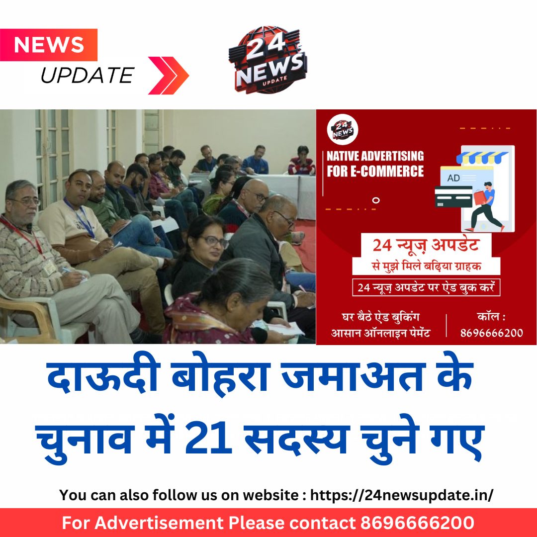 24 न्यूज़ अपडेट. उदयपुर 2 दिसंबर 2024। सुधारवादी बोहरा समुदाय से संबद्ध दाऊदी बोहरा जमाअत, उदयपुर के 15वे आम चुनाव 1 दिसंबर 2024 को बोहरवाड़ी स्थित जमाअत खाना में सम्पन्न करवाए गए। जिनमे चुनाव के ज़रिये 21 सदस्यों का चुनाव किया गया।