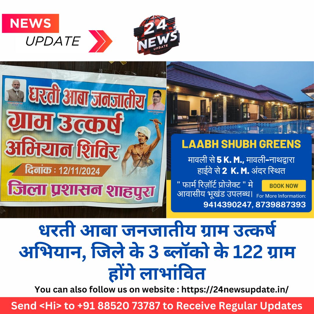 24 न्यूज़ अपडेट शाहपुरा. भारत सरकार के जनजातीय कार्य मंत्रालय द्वारा गत 02 अक्टूबर से धरती आबा जनजातीय ग्राम उत्कर्ष अभियान शुरू किया गया है। अभियान में 500 एवं अधिक जनसंख्या तथा 50 प्रतिशत जनजातीय आबादी वाले ग्रामों को लाभांवित किया जाएगा। इन ग्रामों में निवासरत जनजातीय वर्ग के लोगों को विभिन्न विभागीय योजनाओं का शत प्रतिशत लाभ मिल सकेगा। साथ ही संबंधित विभागों द्वारा सर्वे उपरांत प्रस्तुत कार्यों की शासन स्तर से स्वीकृति उपरांत अन्य योजना व सुविधाओं का लाभ भी सुनिश्चित किया जाएगा।