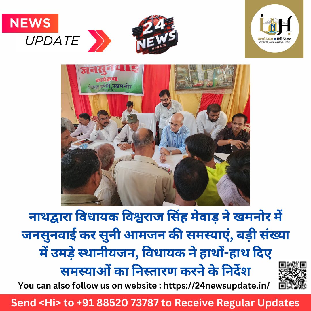 24 न्यूज़ अपडेट नाथद्वारा। नाथद्वारा विधायक श्री विश्वराज सिंह मेवाड़ ने मंगलवार को खमनोर में जनसुनवाई का आयोजन कर आम जन की समस्याओं को सुना और उनका समाधान करने के लिए आवश्यक निर्देश दिए। इस जनसुनवाई में बड़ी संख्या में ग्रामीण उपस्थित रहे, जिन्होंने अपनी समस्याएं विधायक श्री मेवाड़ के सामने रखीं।