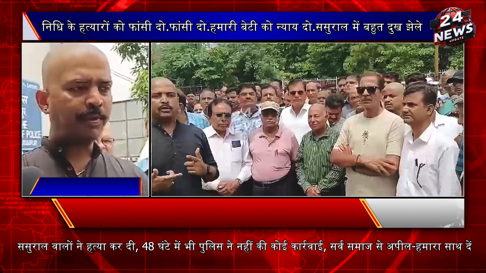 रिपोर्ट: अमानत अली 24 न्यूज अपडेट उदयपुर। शादी के बाद दोनों की एक 2 साल की बेटी है। सोमवार दोपहर के समय निधि पंचाल की संदिग्ध हालत में मौत हो गई। डूंगरपुर कोतवाली थाना क्षेत्र में प्रतापनगर कॉलोनी में शादी के 4 साल बाद निधि पंचाल की मौत का मामला गर्माने लगा है। पिता यश पंचाल चाचा प्रियंक लोहार के साथ बडी संख्या में समाजजनों व सर्व समाज की मौजूदगी में आज कलेक्टर आईजी सहित अन्य अफसरों को ज्ञापन दिया गया व हत्यारों को पकडने की मांग की गई। पुलिस के साथ गर्मागर्मी हुई व खूब नारेबाजी भी की गई। पिता व चाचा ने बताया कि उदयपुर की बेटी जिसकी डूंगरपुर में ससुराल में संदिग्ध अवस्था में मौत हो गई उसे दहेज के लिए प्रताड़ित किया गया। उसे शादी के बाद से ही परेशान किया जाने लगा। उन दो भाइयों की शादी एक साथ हुई थी। अहमदाबाद वाली पार्टी ने स्वर्ण आभूषण ज्यादा दिए थे। ऐसे में हमारी बेटी को हमेशा टार्चर करने लगे। 13 जनवरी को जब उसकी पहली संतान लड़की हुई तो उसकी साथ इंदिरा पंचाल पत्नी प्रकाश पंचाल ज्यादा मिसबिहेव करने लग गई, ताने मारने लगी, हाथापाई करने लगी। चांटे मारने लगी। हमारी बेटी ने कई बार हमसे यह बात कही मगर हमने इस पर भी एकाएक बेटी होने की वजह से संप रख कर शालीनता से प्रकाशजी पंचाल के बड़े भाई बलदेवजी पंचाल को बताया। इंदिरा पंचाल को बताया लेकिन वो लोग कभी एग्री नहीं कर पाए हमेशा आश्वासन देते रहे। अंततः 24 जून को फंदे पर लटक गई। पोस्ट मार्टम रिपोर्ट में भी कारण सामने नहीं आए हैं। मैं इसे बार-बार हत्या कह रहा हूं। अभी तक उन पर 48 घंटे बाद भी कोई कार्रवाई नहीं की गई है। गौरतलब है कि मृतका का पति निशांत बैंगलोर में नौकरी करता है। हमारी बेटी ने ससुराल में बहुत दुख झेले, ससुराल वालों ने हत्या कर दी, 48 घंटे में भी पुलिस ने नहीं की कोई कार्रवाई, सर्व समाज से अपील-हमारा साथ दें। Share this: Share on X (Opens in new window) X Share on Facebook (Opens in new window) Facebook More Email a link to a friend (Opens in new window) Email Share on WhatsApp (Opens in new window) WhatsApp Like this:Like Loading... Related Discover more from 24 News Update Subscribe to get the latest posts sent to your email. Type your email… Subscribe Post navigation यात्रीगण कृपया ध्यान दें,,,,गुलाबबाग में महाराणा प्रताप एक्सप्रेस दुरूस्त होकर फिर से ट्रेक पर आ चुकी है, नया इंजन भी आने वाला है ताकि अगली बार कोई परेशानी नहीं हो,,,, बिजली कटौती के खिलाफ अमित श्रीवास्तव व क्षेत्रवासियों का सेक्टर-4 पावर हाउस के बाहर धरना, बारिश में भी डटे हुए, व्यवस्थाएं सुधारने की कर रहे मांग