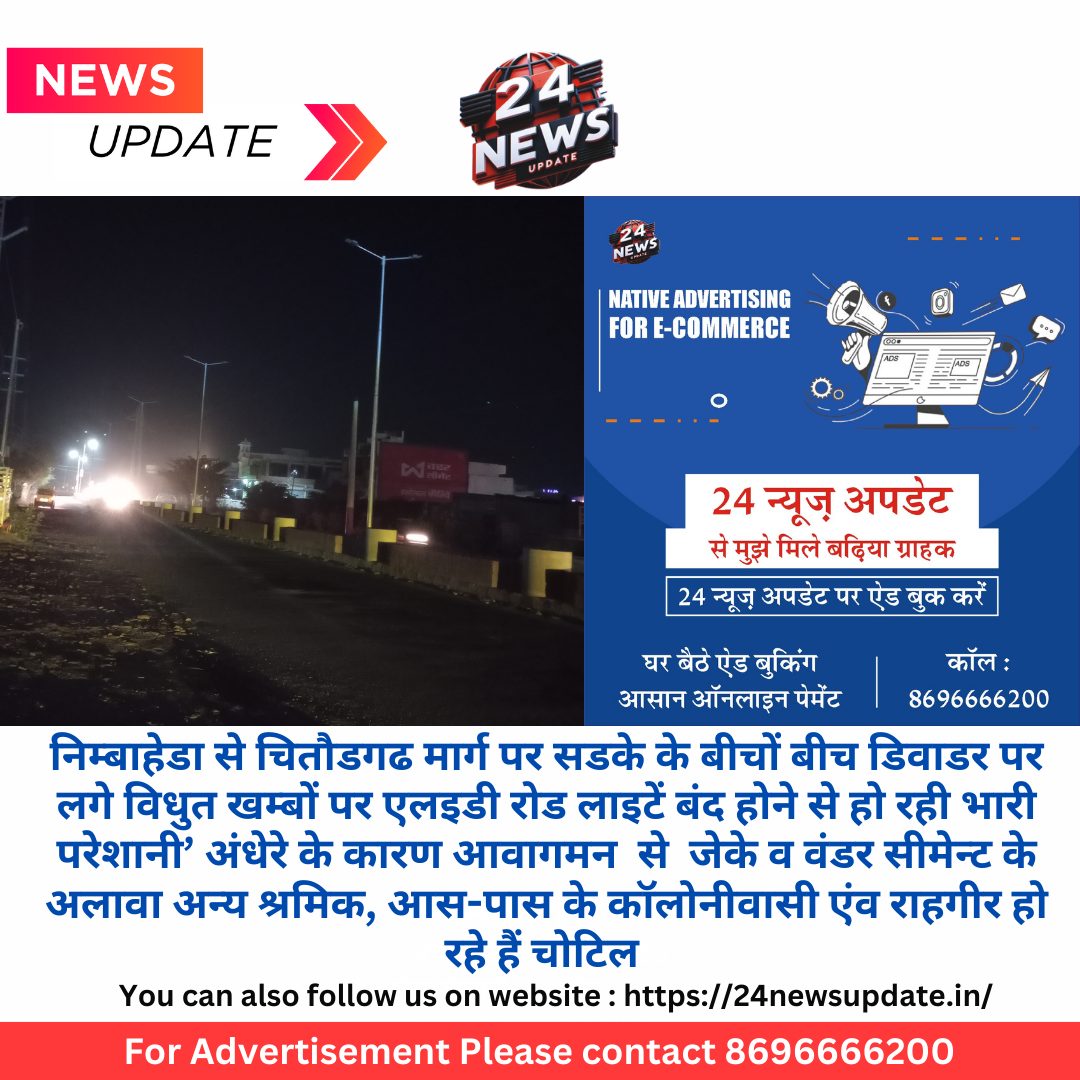 अब देखना यह है कि सम्बधिंत विभाग के अधिकारीगण द्वारा उपरोक्त मामले को गंभीरता से लेकर सडक के बीचों बीच लगे डिवाडर पर लगे विधुत खम्बों एलइडी रोड लाइटें सही करवाई जाएगी या मामले को नजर अंदाज कर यूं ही रोड पर आवागमन करने वालों को अंधेरे में धकेल दिया जाएगा। अधिकारी इस मार्ग से कई बार गुजरते वे चार पहिया एसी कार में बेठकर उनके वाहन की रोषनी द्वारा मार्ग पर आवागमन करते रहते उन्हें राहगीरों व जेके व वंडर सीमेन्ट के श्रमिकों के छोटे वाहनो से आवागमन करने में जो दिक्कत महसुस होती हैं वो दिक्कत चार पहिया एसी कारों में बेठकर गुजरते रहते उन्हें अंधेरा दिखाई नहीं देने से कोई दिक्कत नहीं होने से ऐसे विकास सौन्दर्यकरण के नाम पर लाखों रूपए का विकास पर लाखों रूपए खर्च करने से निम्बाहेडा के निवासियों व श्रमिकों को क्या संदेष देना चाहते है। किसी के समझ में नहीं आ रहा हैं ।