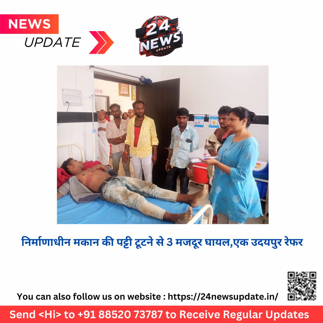 24 न्यूज़ अपडेट सलूंबर। जिले के सेमारी थाना क्षेत्र के लिम्बडी गांव में एक नव निर्माणाधीन मकान की छत पर पत्थर की पट्टियां चढ़ाते समय एक पट्टी के टूटने से 3 मजदूर घायल हो गए।