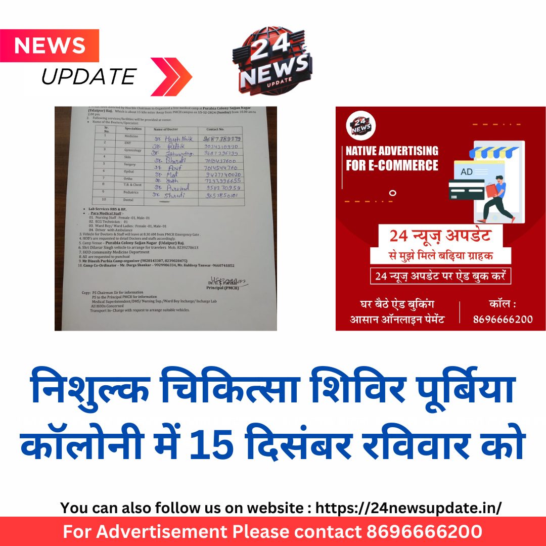 24 न्यूज़ अपडेट उदयपुर. पूर्बिया कलाल समाज उदयपुर एवं पेसिफिक मेडिकल कॉलेज एवं हॉस्पिटल भीलो के बेदला उदयपुर के संयुक्त तत्वाधान में निशुल्क चिकित्सा शिविर पूर्बिया कॉलोनी सज्जन नगर, उदयपुर में 15 दिसंबर रविवार को आयोजित किया जाएगा। नरेश पूर्बिया ने बताया कि चिकित्सा शिविर प्रातः 10 बजे से दोपहर 2 बजे तक पूर्बिया कॉलोनी के शिव मंदिर परिसर में आयोजित किया जाएगा। शिविर में बीपी, शुगर, ईसीजी सहित अन्य जांचें, परामर्श व दवाइयां दि जाएगी। शिविर में फिजिशियन डॉ हार्दिक नायक, नाक, कान, गला विशेषज्ञ डॉ रितिक, गाइनेकोलॉजिस्ट डॉ ईश्वर, चर्म रोग विशेषज्ञ डॉ भारती, शल्य चिकित्सक डॉ आरिफ, नेत्र रोग विशेषज्ञ डॉ मौथ, हड्डी रोग विशेषज्ञ डॉ यश , टीबी एण्ड चेस्ट स्पेशलिस्ट डॉ श्रुति सेवाएं देंगी। चिकित्सा शिविर की व्यवस्था एवं प्रचार प्रसार में अध्यक्ष दिनेश पूर्बिया,भरत पूर्बिया,सूर्य प्रकाश पूर्बिया, भंवर लाल पूर्बिया, भेरू लाल पूर्बिया, यशवंत पूर्बिया, लोकेश पूर्बिया,पन्ना लाल पूर्बिया, दिलीप पूर्बिया ,रेवंत पूर्बिया, ईश्वर पूर्बिया ,बृजमोहन पूर्बिया, नितेश चौधरी व रमेश पूर्बिया सहित कई नवयुवक लगें हुए हैं। Share this: Share on X (Opens in new window) X Share on Facebook (Opens in new window) Facebook More Email a link to a friend (Opens in new window) Email Share on WhatsApp (Opens in new window) WhatsApp Like this:Like Loading... Related Discover more from 24 News Update Subscribe to get the latest posts sent to your email. Type your email… Subscribe Post navigation बीएन कॉलेज ऑफ फार्मेसी की शोधार्थी प्रिंसी अग्रवाल को पीएचडी की उपाधि प्रदान सांसद मन्नालाल रावत ने बावडियों के संरक्षण का मुद्दा संसद में रखा