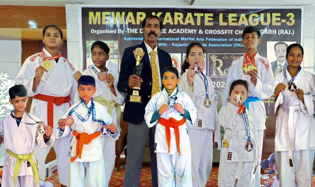 24 न्यूज अपडेट. उदयपुर। 4-5 जनवरी को मेवाड़ कराटे लीग तृतीय नेशनल ओपन कराटे चैंपियनशिप 2025 का आयोजन टर्बन वैली रिशोर्ट ट्रांसपोर्ट नगर उदयपुर में हुआ। इस चैंपियनशिप में विभिन्न राज्यों से लगभग 250 खिलाड़ियों ने भाग लिया। उदयपुर से कमांडो मार्शल आर्ट एंड फिटनेस एकेडमी के 16 प्रतिभागियों ने भाग लिया सभी प्रतिभागियों ने अपने कराटे तकनीकों का शानदार प्रदर्शन करते हुए कराटे चैंपियनशिप में बेस्ट टीम का अवार्ड खिताब जीता और बेस्ट टीम अवार्ड ट्रॉफी कमांडो मार्शल आर्ट अकैडमी उदयपुर ने प्राप्त कर उदयपुर, मेवाड़ का गौरव और कीर्तिमान बढ़ाया । इस कराटे चैंपियनशिप में काता और कुमिते दो स्पर्धा रही जिसमें कमांडो मार्शल आर्ट अकादमी के सभी प्रतियोगियों ने पूरे उत्साह जोश एवं दमखम के साथ पदक जीते,। कमांडो मार्शल आर्ट टीम में महिला वर्ग में पदक जीतने वाले प्रतिभागियों में मनस्वी सोनवाल ने काता में स्वर्ण पदक कुमिते में कांस्य पदक, नित्या कालानी काता में कांस्य पदक कुमिते में स्वर्ण पदक , रियांशी वया काता में स्वर्ण पदक कुमिते में रजत पदक , अनिका कुमारी काता में स्वर्ण पदक कुमिते में कांस्य पदक , आराध्या कुमारी काता में कांस्य पदक कुमिते में कांस्य पदक, वर्षणा बोहरा काता में कांस्य पदक , रिदम राव काता में कांस्य पदक ,