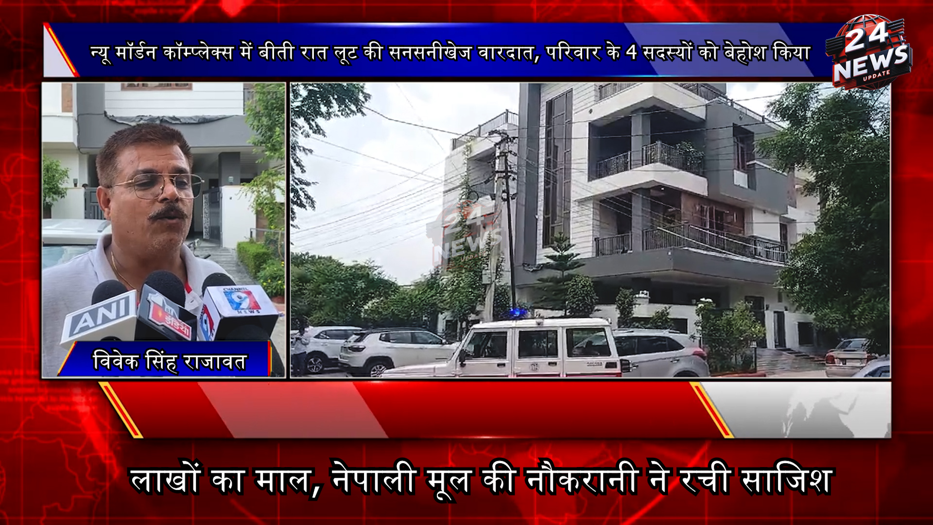 24 न्यूज अपडेट उदयपुर। उदयपुर के सुखेर थाना इलाके के सेलिब्रेशन मॉल के पीछे न्यू मॉर्डन कॉम्प्लेक्स में लूट की सनसनीखेज वारदात हो गईं है। कल रात को घर के सदस्यों को बेहोश कर नेपाली मूल की महिला नौकर ने अपने साथियों के साथ वारदात को अंजाम दिया। बताया गया कि घर के 4 सदस्यों को बेहोश करने के बाद बदमाशों ने लूट की वारदात की। संजय गांधी, शिल्पा गांधी 18 साल की बेटी, 12 साल के बेटे के साथ वारदाता हुई है। संजय गांधी बिजनेसमैन हैं। एसपी योगेश गोयल, एडिशनल एसपी उमेश ओझा, हिमांशुसिंह राजावत, कैलाश खटीक आदि मौके पर हैं। घर पर ही काम करने वाले नेपाली मूल की नौकरानी और उसके साथी सीसीटीवी में दिखाई दिए हैं। सबसे पहले लूट करने वालों ने परिवार के सदस्यों को बेहोंश किया उसके बाद घर की तिजौरी आदि को तोड़ कर घर में रखा कीमती सामान, जेवर आदि लेकर फरार हो गए। कितना नुकसान हुआ इसका अंदाजा लगाया जा रहा है। परिवार के सदस्यों को कैसे बेहोंश किया गया इसकी भी जांच की जा रही है। पडोसियों की सजगता से बडा हादसा टल गया है। सुबह जब पडोसियों ने परिवार की एक बच्ची को बंधी हुई अवस्था में करहाते देखा तो वे स्तब्ध रह गए। तुरंत मदद को दौड़े व उसके बाद पुलिस को सूचित किया। पुलिस की मौजूदगी में बेहोशी की अवस्था में सभी को हॉस्पिटल पहुंचाया गया है। पुलिस के आला अधिकारी हॉस्पिटल पहुंचे हैं व मामले की जांच में जुटे है।ं घर में लूट के समान की जानकारी भी परिवार के सदस्यों के होंश में आने के बाद हो पाएगी। एफएसएल की टीम मौके पर पहुंच गई है व गहन जांच करके सुबूत जुटाए जा रहे हैं। पड़ोसी विवेकसिंह राजावत जो खुद पुलिस में अधिकारी हैं, उन्होंने बताया कि सुबह 5 बजे बाहर निकले तो पडोसी की बच्ची हाथ पांव से बंधी हुई दिखी व सोई सोई मम्मी-मम्मी चिल्ला रही थी। बच्ची कीचड में सन्न थी। कपडे व प्लास्टिक से हाथ बंधे हुए थे। वे कैंची लेकर आए व उसे मुक्त किया। पुलिस को बुलाया, सभी सोसायटी के सदस्यों की मौजूदगी में पुलिस के साथ उपर जाकर देखा तो पति पत्नी अचेत अवस्था में थे। उनको झकझोर कर जगाया गया। छोटा बेटा बिल्कुल अचेत था। सबको नीचे लाकर सबने मिल कर हॉस्पिटल पहुंचाया। अभी वो ठीक है खतरे से बाहर हैं। चार संदिग्ध सीसीटीवी में दिख रहे हैं। एक महिला मेड सर्वेंट के रूप में नेपाली मूल की महिला डेढ से दो महीने से काम कर रही थी। उस पर शक जा रहा है। दो जने सबसे पहले एक बार में पौने बारह व दो साढे बाहर बजे रात को अंदर घुसे जो सीसीटीवी में दिख रहा हैं। अंदर एक तिजोरी तोड दी गई व उसे साफ कर दिया गया। एक की चाबी व पासवर्ड के लिए लिए बच्ची को खूब टार्चर किया गया। वे अपने साथ बडे बडे चाकू व पेचकस आदि लेकर आए थे। पूरी तैयारी के साथ आए थे। बच्ची नाल में घिसटती हुई नीचे आई।